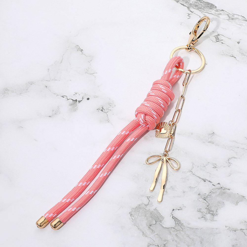 Details • Size : 9.5" L • Trendy rope keychain featuring a knotted cord design accented with dangling bow and heart charms, finished with a secure clip for easy attachment to keys or bags. Adds playful charm and stylish movement to everyday essentials while combining decorative flair with practical use. • Lead and Nickel Compliant