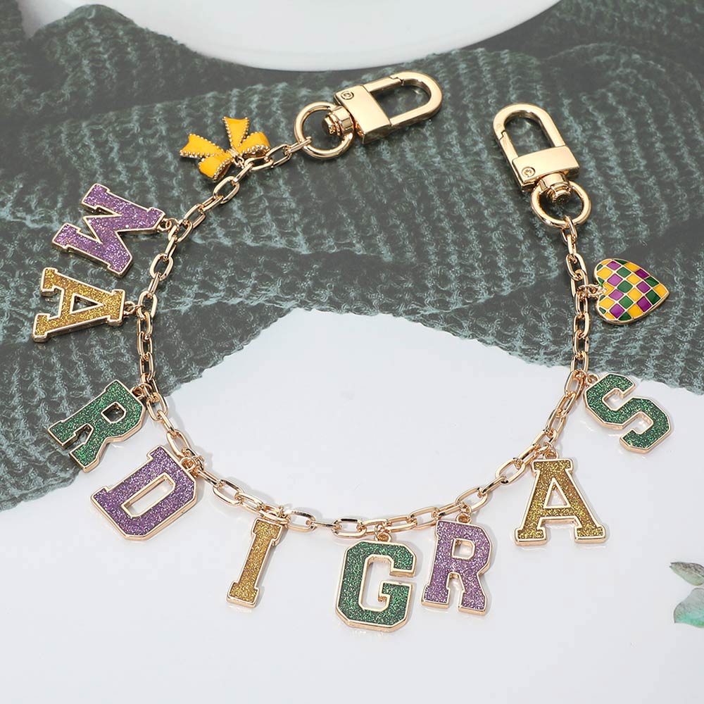 Details • Size : 13" L • Decor Size : 1" L • Festive Mardi Gras–inspired letter charm chain featuring bold alphabet accents, playful icons, and dual clasp ends for easy attachment. Designed to clip onto handbags, totes, backpacks, or keyrings for a standout seasonal look. A fun statement accessory ideal for parade outfits, party styling, gift items, and eye-catching boutique displays. • Lead and Nickel Compliant
