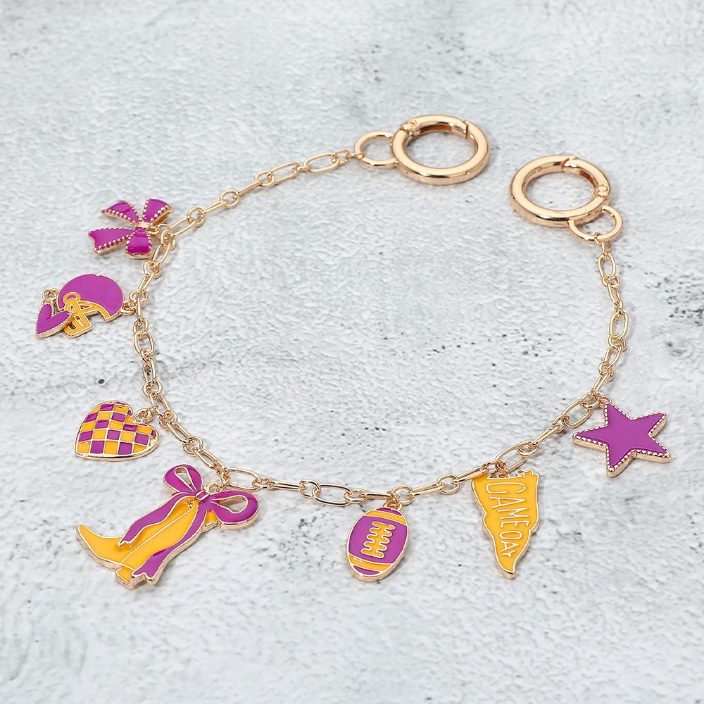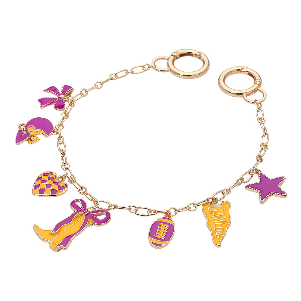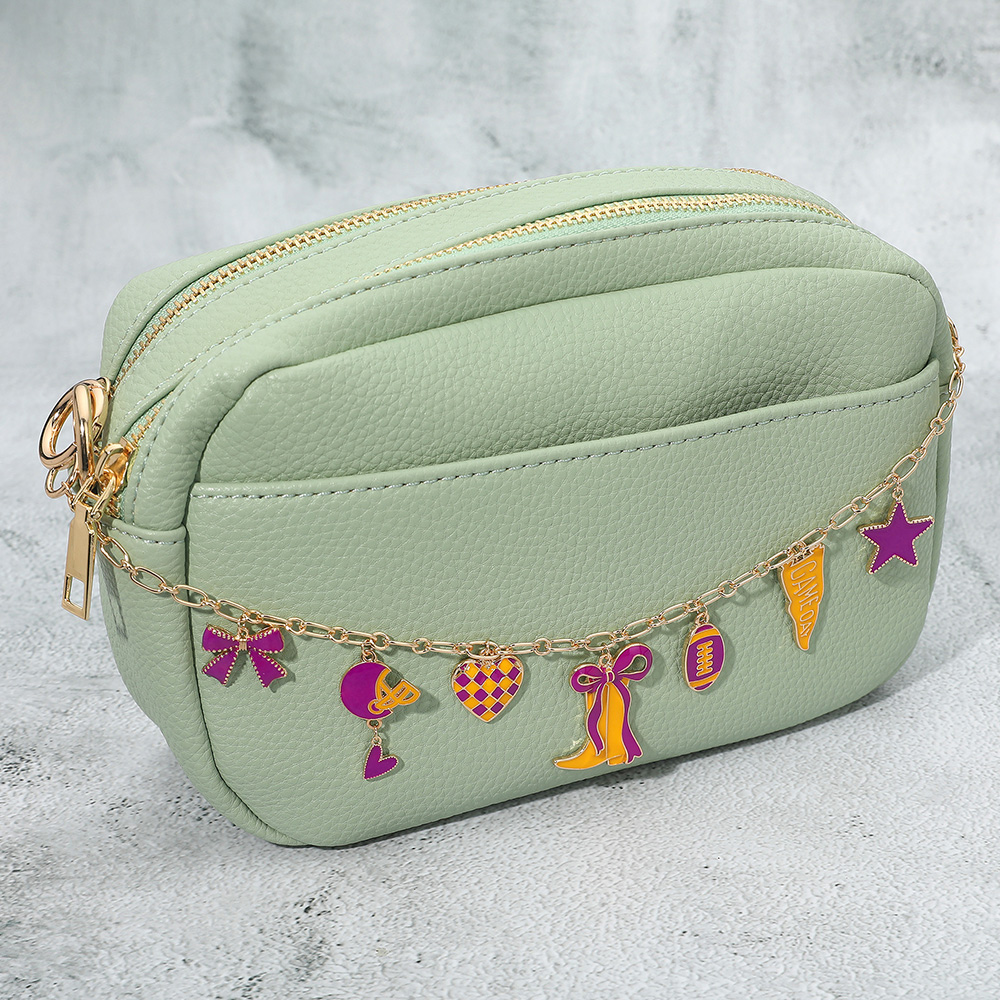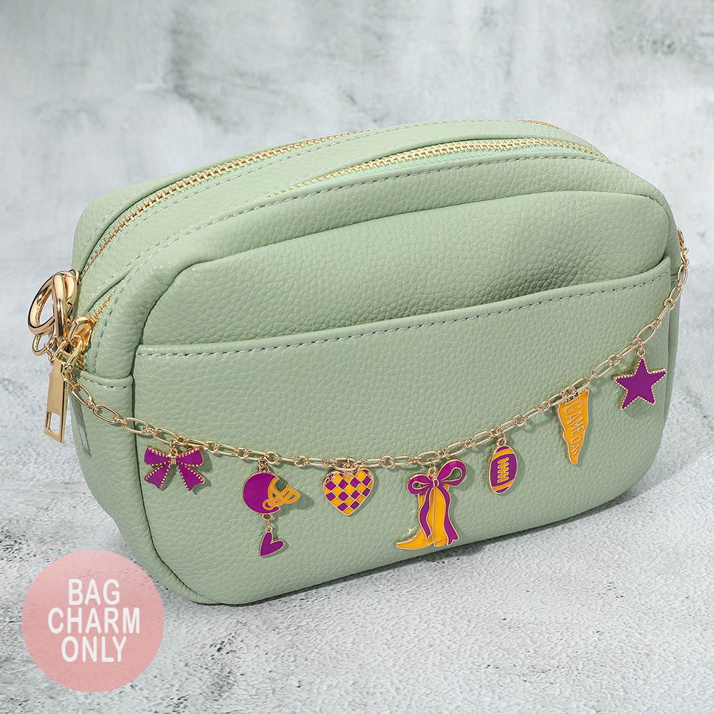 • Bag charm featuring playful gameday accents including football, helmet, boots, stars, hearts, and cheer icons. A fun accessory to show team spirit, personalize bags, and add a sporty touch to gameday outfits.