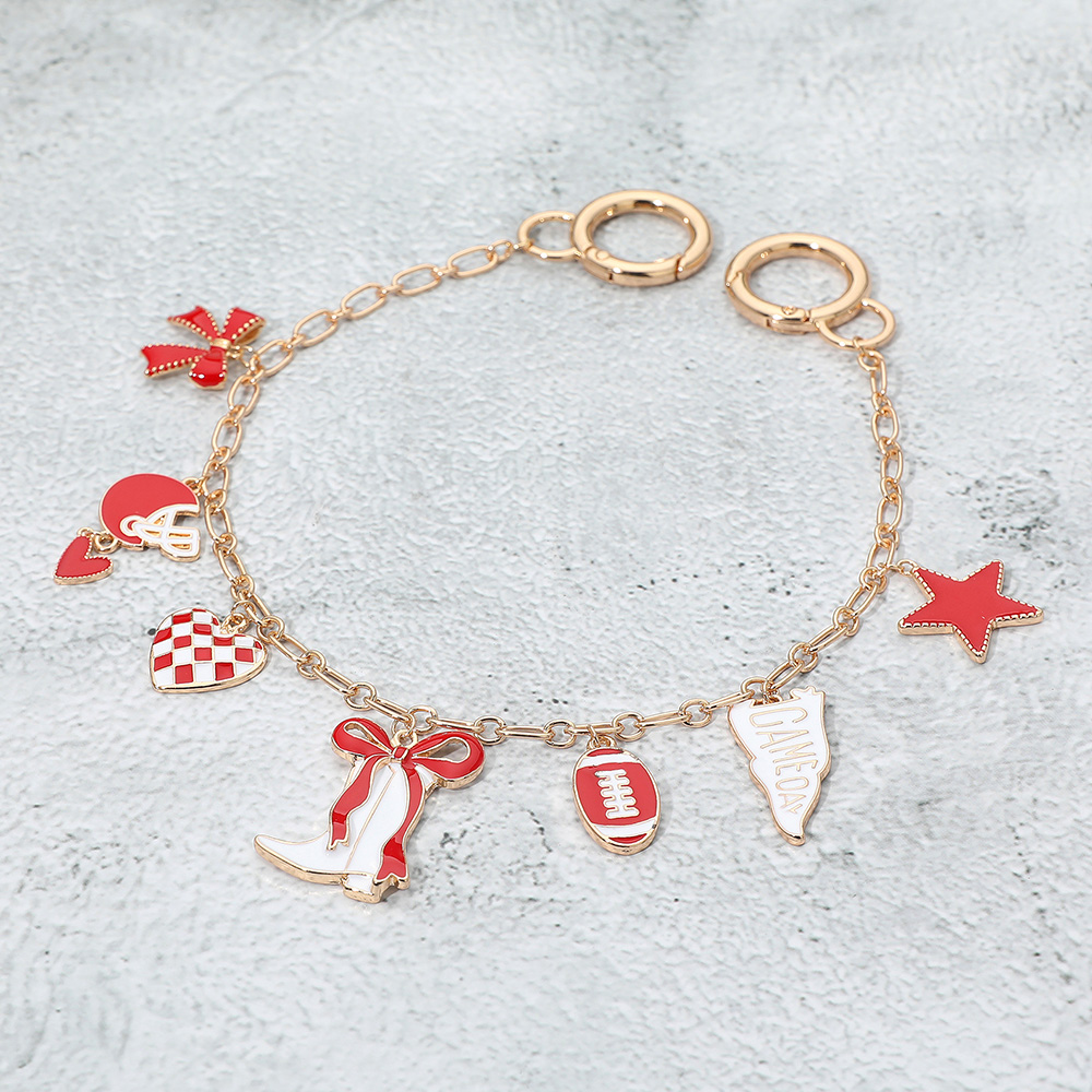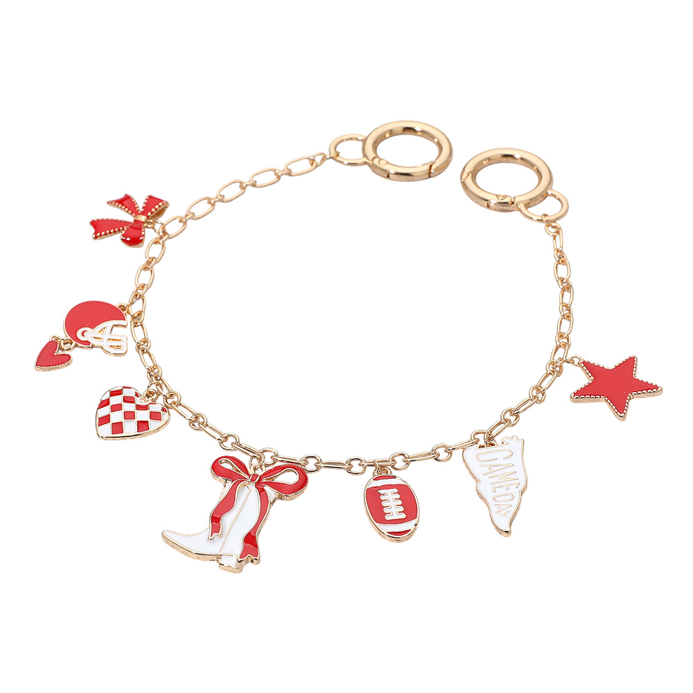 • Bag charm featuring playful gameday accents including football, helmet, boots, stars, hearts, and cheer icons. A fun accessory to show team spirit, personalize bags, and add a sporty touch to gameday outfits.