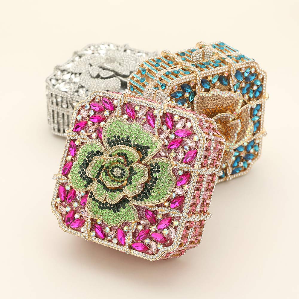 • Make a dramatic entrance with this floral crystal box evening clutch featuring a bold sculpted flower motif, faceted embellishments, and a structured silhouette. Ideal for weddings, galas, and formal events, it holds essentials in standout style while adding glamorous impact to any outfit or gift occasion.
