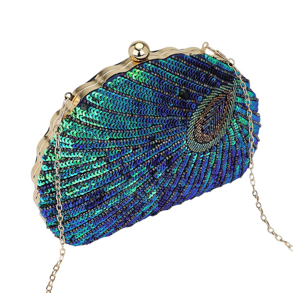 Beaded Sequin Peacock Clutch Evening Bag Crossbody Bag