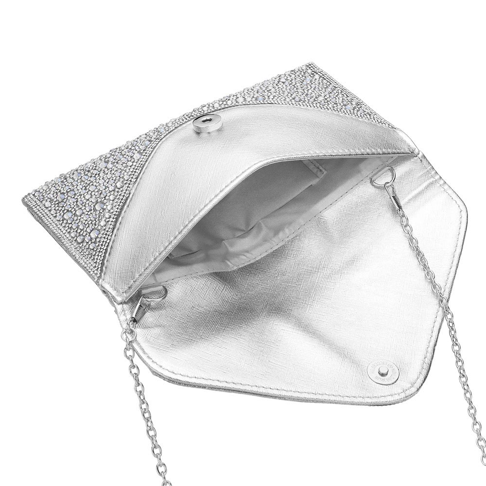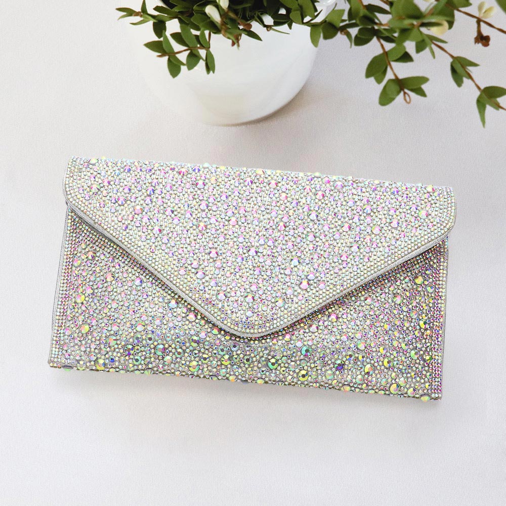 Details • Size : 9" X 5" • Strap Size : 47" L / Detachable • One Inside Slip Pocket • Magnetic Closure • Elevate your formal attire with this glamorous envelope-style clutch, featuring dazzling embellishments and a sleek chain strap. Ideal for weddings, proms, or evening events, this refined accessory adds just the right amount of sparkle to any sophisticated look.
