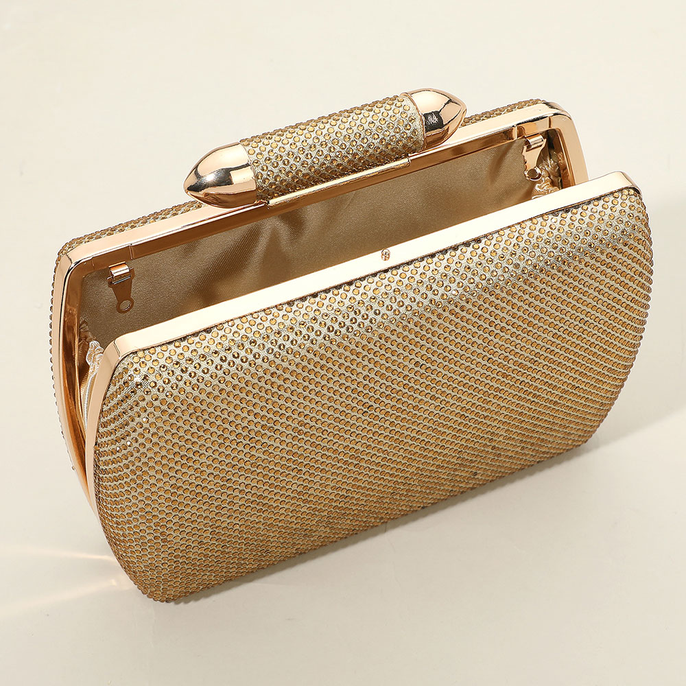 • Glamorous rhinestone clutch purse featuring a curved design, gold-tone accents, and a secure clasp closure. Perfect for weddings, galas, and formal events, this evening handbag adds sparkle and sophistication, complementing elegant outfits with timeless charm and refined style.
