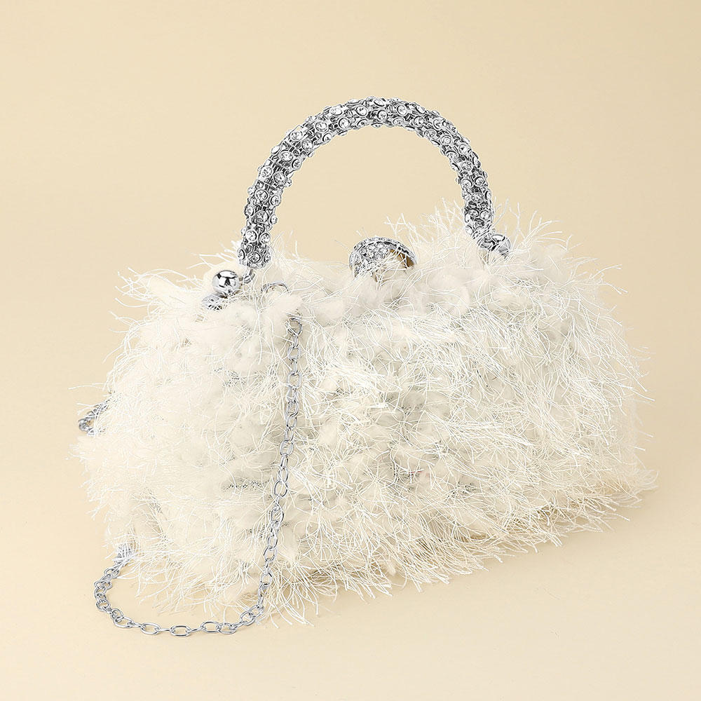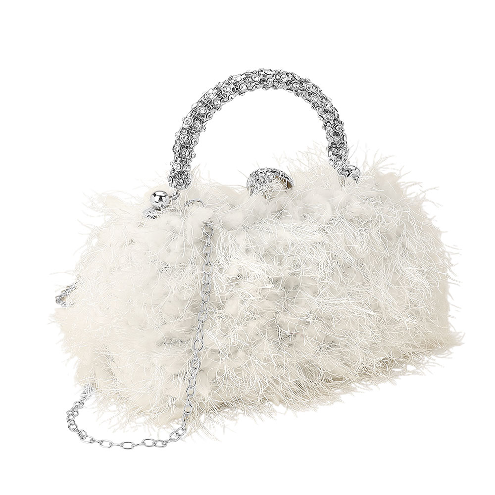 • This elegant evening bag features soft feather accents, a crystal-embellished handle, and a delicate chain strap for versatile carrying. Perfect for formal events or glamorous nights out, it adds a statement touch of luxury and sophistication to any outfit.
