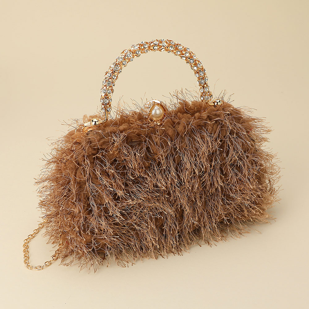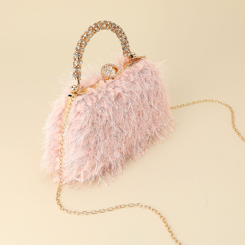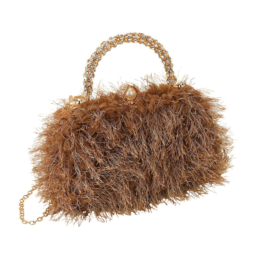 • This elegant evening bag features soft feather accents, a crystal-embellished handle, and a delicate chain strap for versatile carrying. Perfect for formal events or glamorous nights out, it adds a statement touch of luxury and sophistication to any outfit.