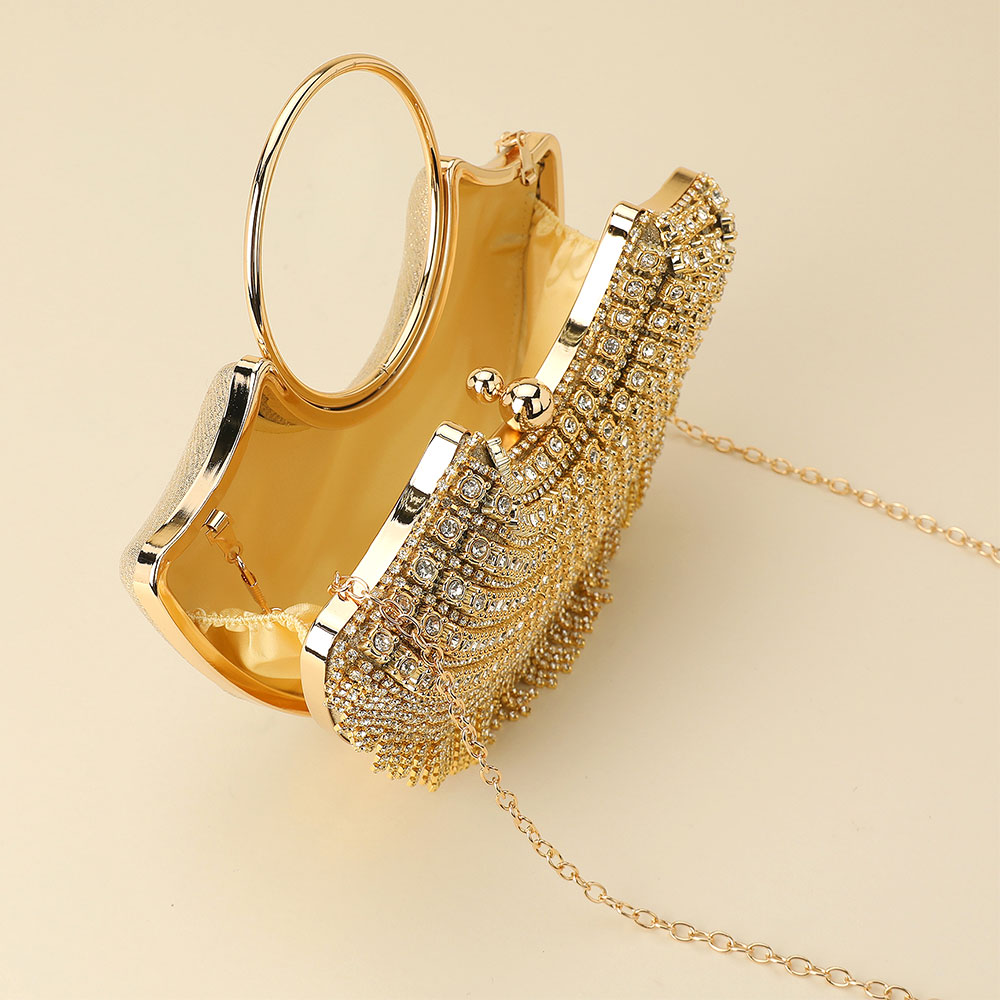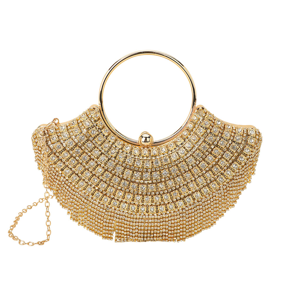 • This radiant crystal evening bag dazzles with intricate rhinestone embellishments, a sleek round handle, and cascading fringe accents. Perfect for glamorous events, weddings, or formal soirĂ©es, it adds a stunning sparkle and modern elegance to any special occasion ensemble.
