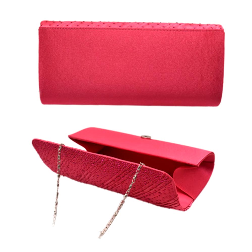 Details • Bag Size : 9" X 2" X 4.25" • Chain Strap Size : 23" L (Detachable) • One Inside Slip Pocket • Magnetic Closure • Shimmer and shine at any event with this elegant metallic evening clutch featuring a refined diagonal textured design. Perfectly sized for your essentials, this sleek and modern accessory adds a touch of sophistication to formal looks, weddings, and special occasions.