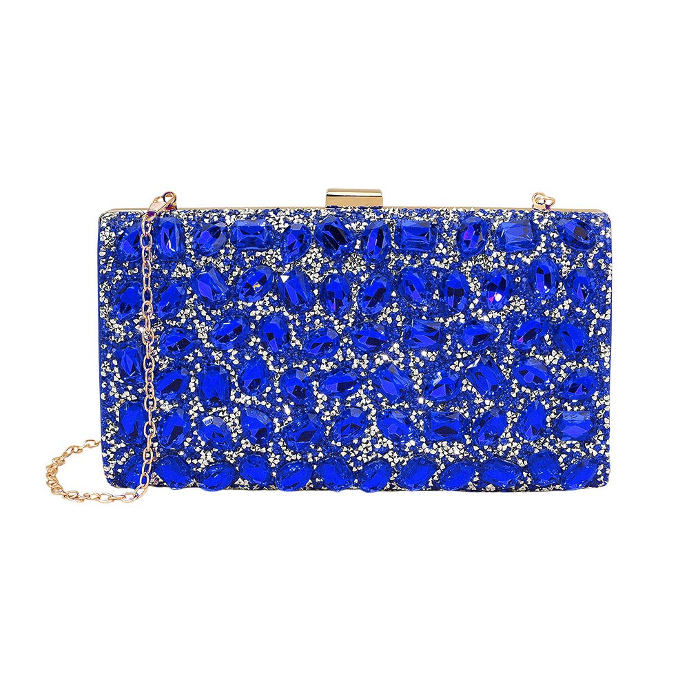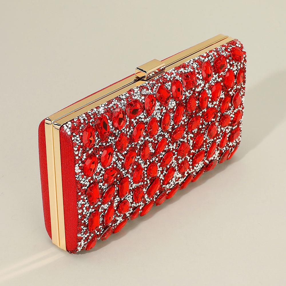 Details • Size : 8.6" X 4.6" X 1.6" • Strap Size : 47" L / Detachable • Clasp Closure • Glamorous evening clutch adorned with sparkling stone accents for a statement look. Designed with a sleek silhouette and chain strap, this stylish accessory adds a touch of elegance to special occasions, parties, and night-out outfits.