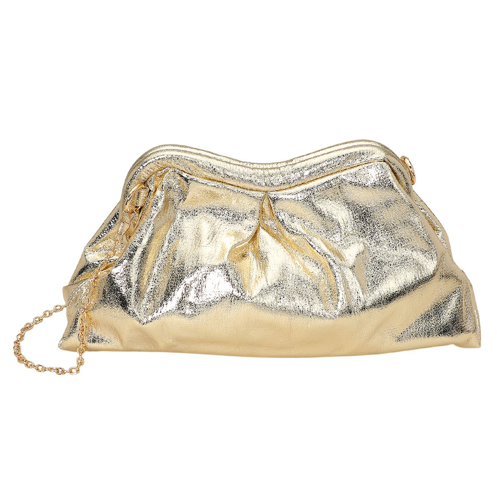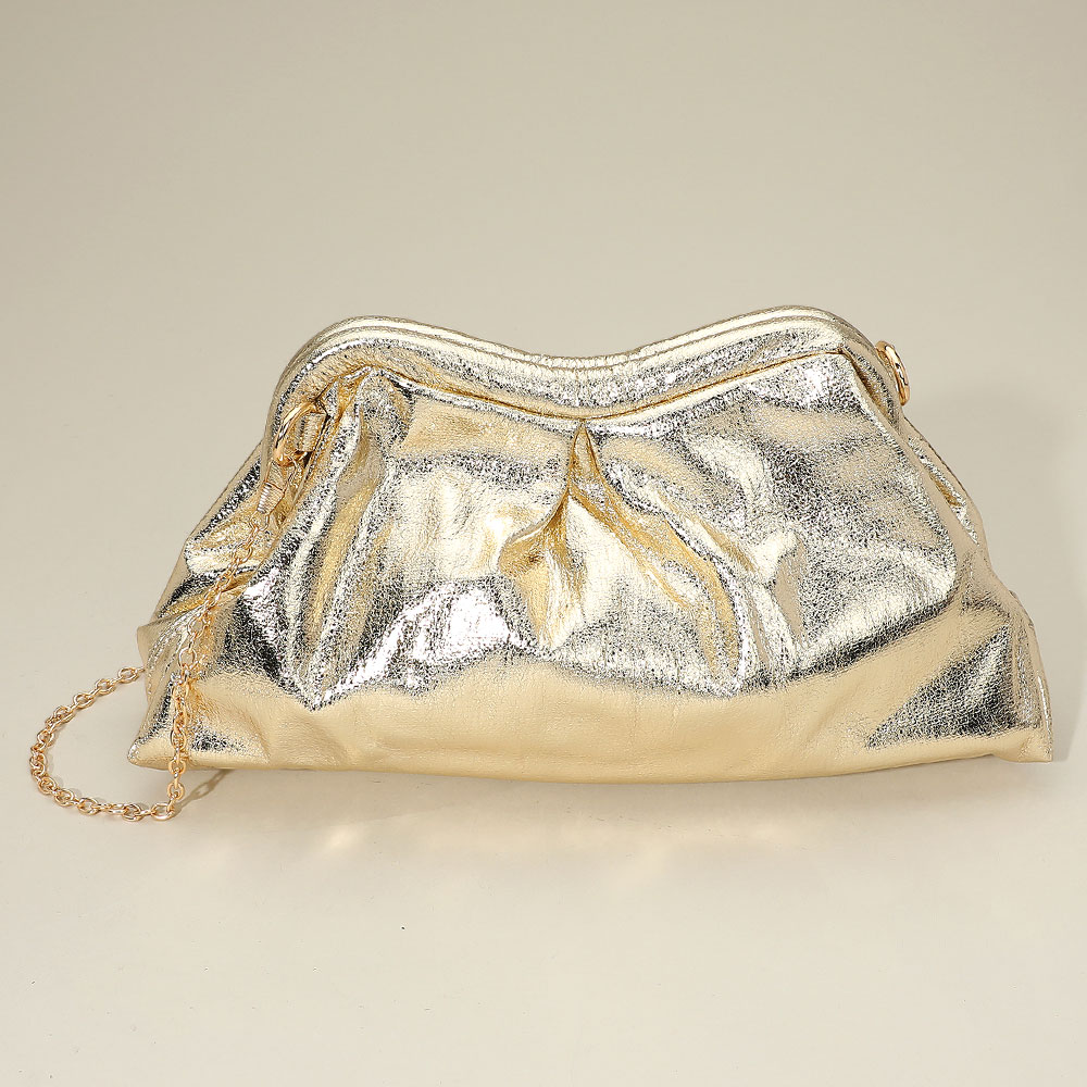 • Elegant metallic clutch with soft pleated detailing and classic frame silhouette. Features a delicate chain strap and spacious interior—perfect for evening wear, parties, and special events.