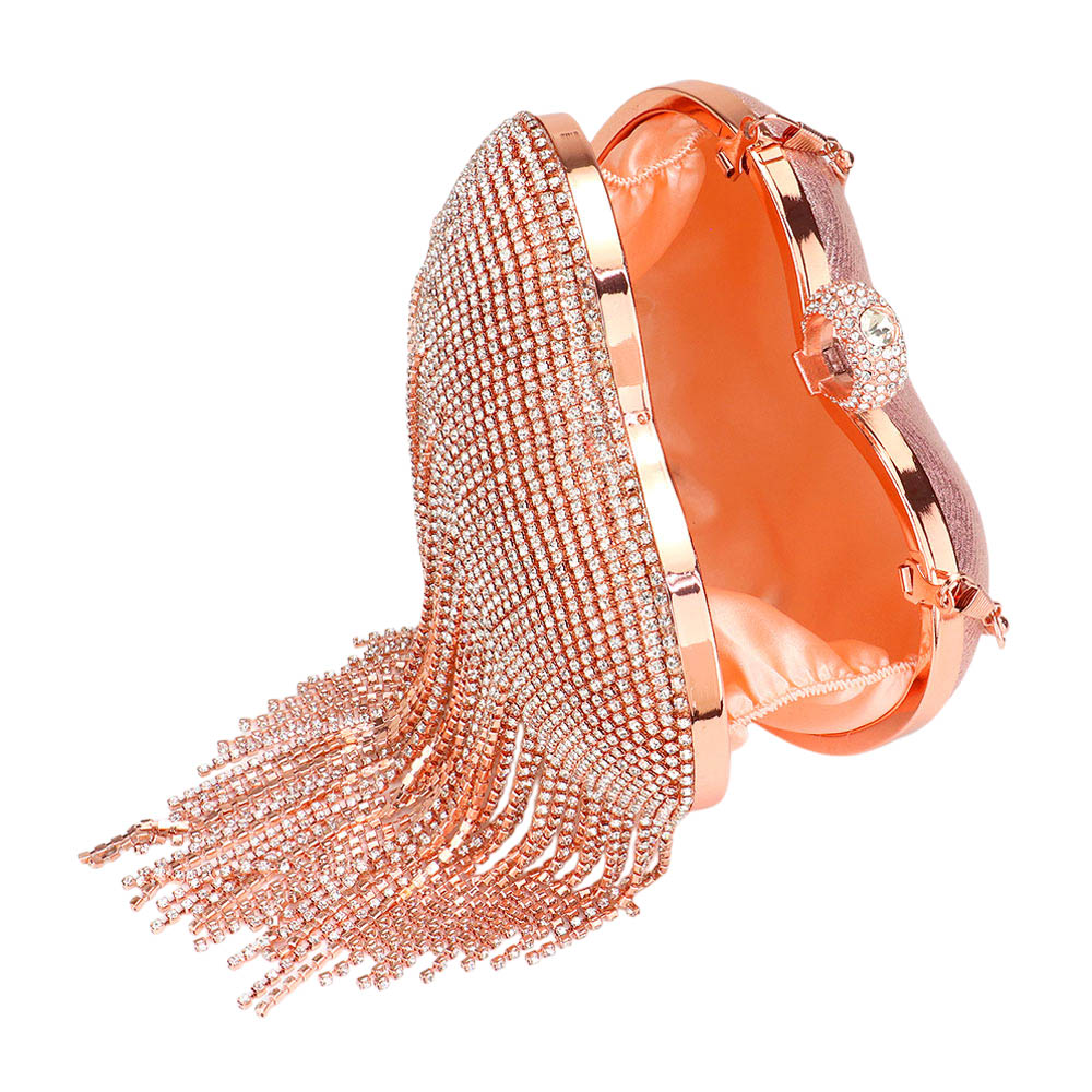 Details • Bag Size : 6.5" X 3.5" X 6.5" • Top Handle Size : 3" L • Chain Strap Size : 46" L (Detachable) • No Inside Pocket • Clasp Closure • Make a bold entrance with this glamorous heart-shaped clutch featuring cascading fringe details. Designed for parties, weddings, and evening events, this chic purse adds sparkle, movement, and elegance to any special outfit.