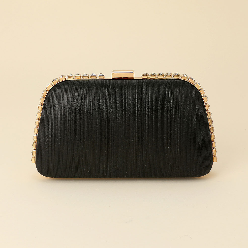 • Chic evening clutch featuring a textured finish, shimmering rhinestone trim, and a detachable chain strap. Designed with a sleek clasp closure and gold-tone accents, this sophisticated handbag is perfect for weddings, parties, and formal events, adding timeless glamour to any outfit.