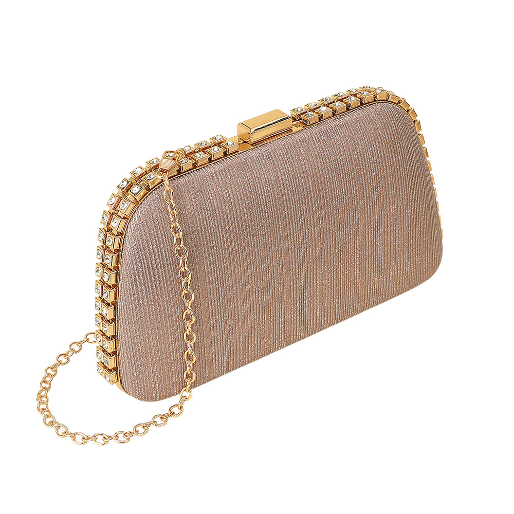 • Chic evening clutch featuring a textured finish, shimmering rhinestone trim, and a detachable chain strap. Designed with a sleek clasp closure and gold-tone accents, this sophisticated handbag is perfect for weddings, parties, and formal events, adding timeless glamour to any outfit.