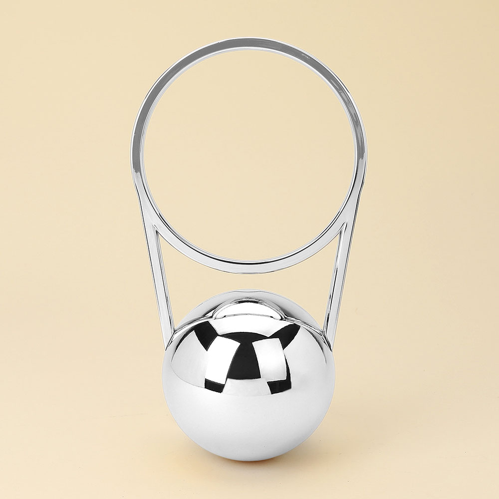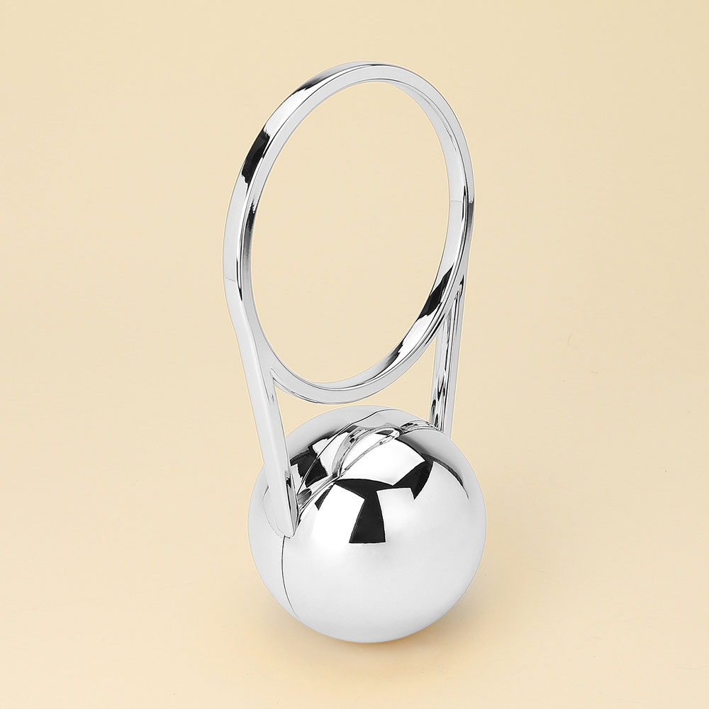 Details • Size : 5.5" X 10" X 4" • Magnetic Closure • This sculptural orb evening clutch showcases a sleek geometric design with a circular ring handle for a statement look. Its structured silhouette and polished finish bring a modern touch to formal and chic outfits, making it a standout accessory for special occasions.