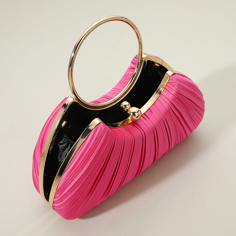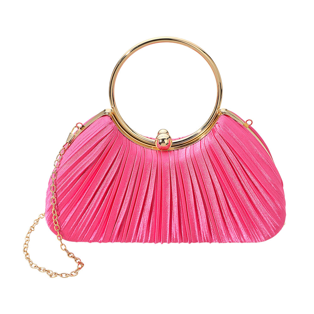 Details • Size : 9" X 5" X 2.5" • Top Handle Size : 3.75" L • Strap Size : 47" L / Detachable • Elegant pleated evening clutch designed with a round ring handle and detachable chain strap. Perfect for weddings, parties, or formal events, this chic accessory adds refined style and sophistication to any outfit.