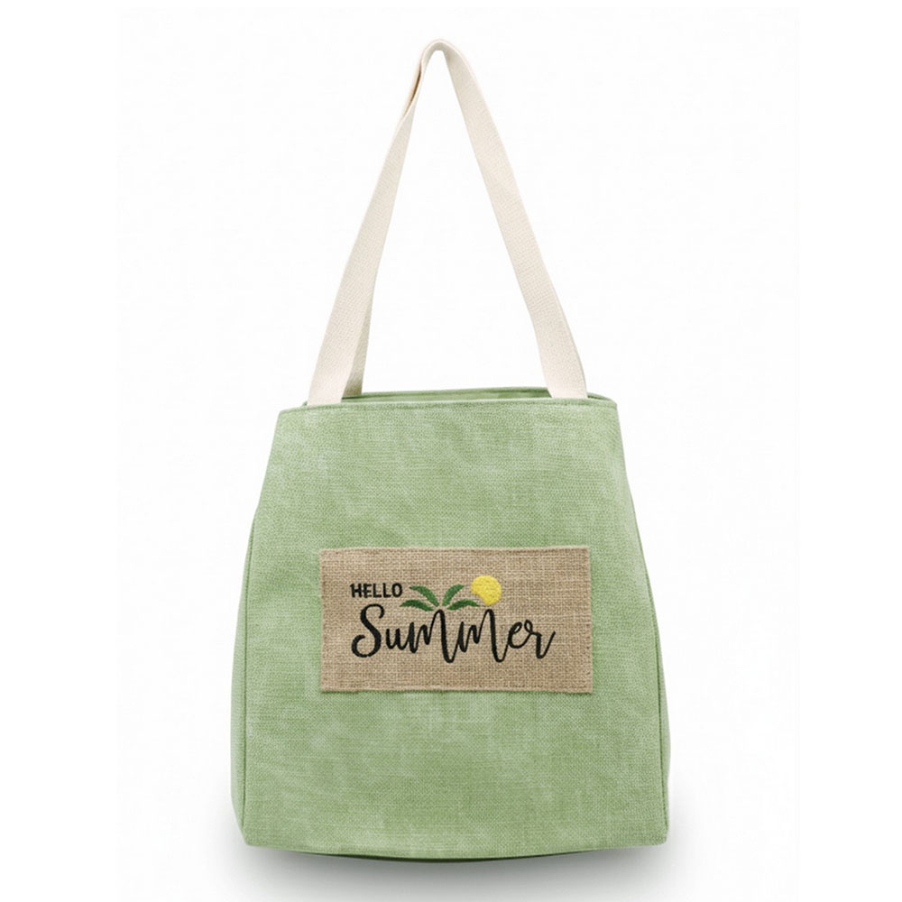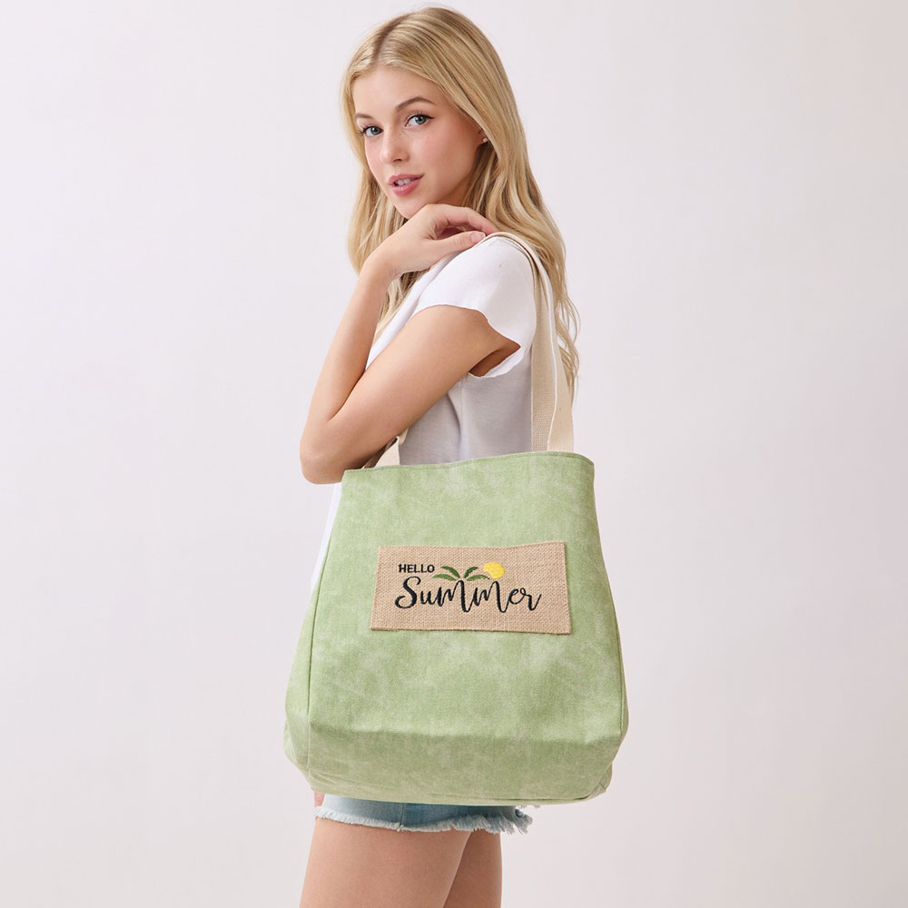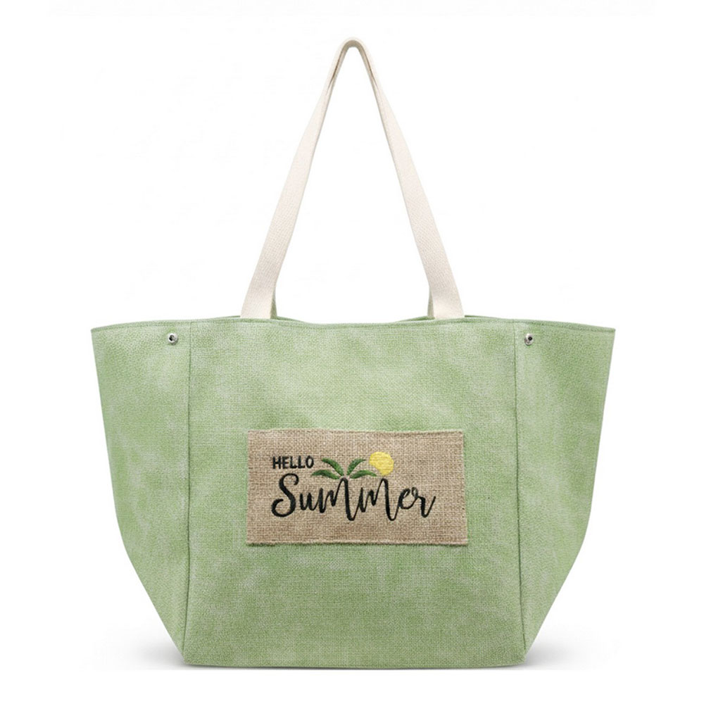 • Spacious everyday tote bag designed with a message patch for casual outings, travel, beach trips, and seasonal retail displays. Features a roomy interior and comfortable shoulder straps, making it ideal for carrying daily essentials, vacation must-haves, and warm-weather lifestyle accessories.