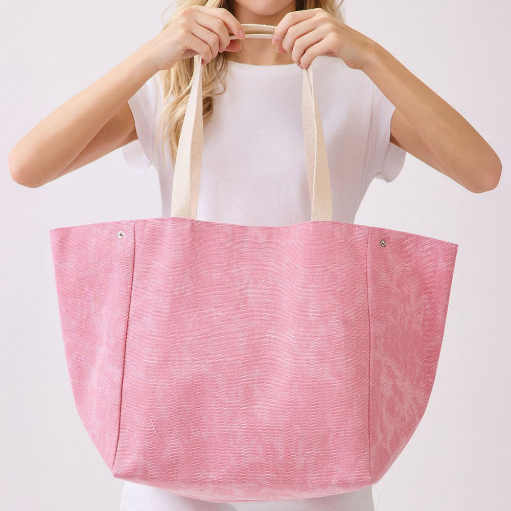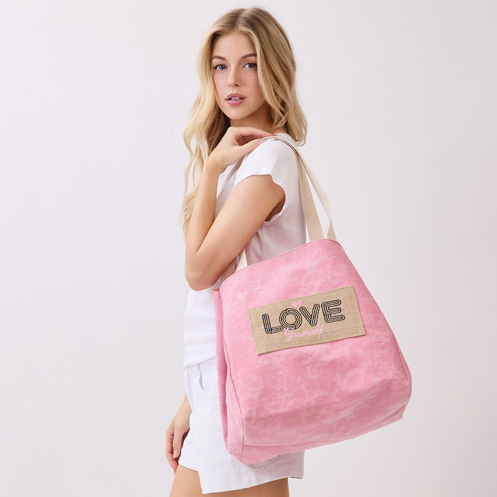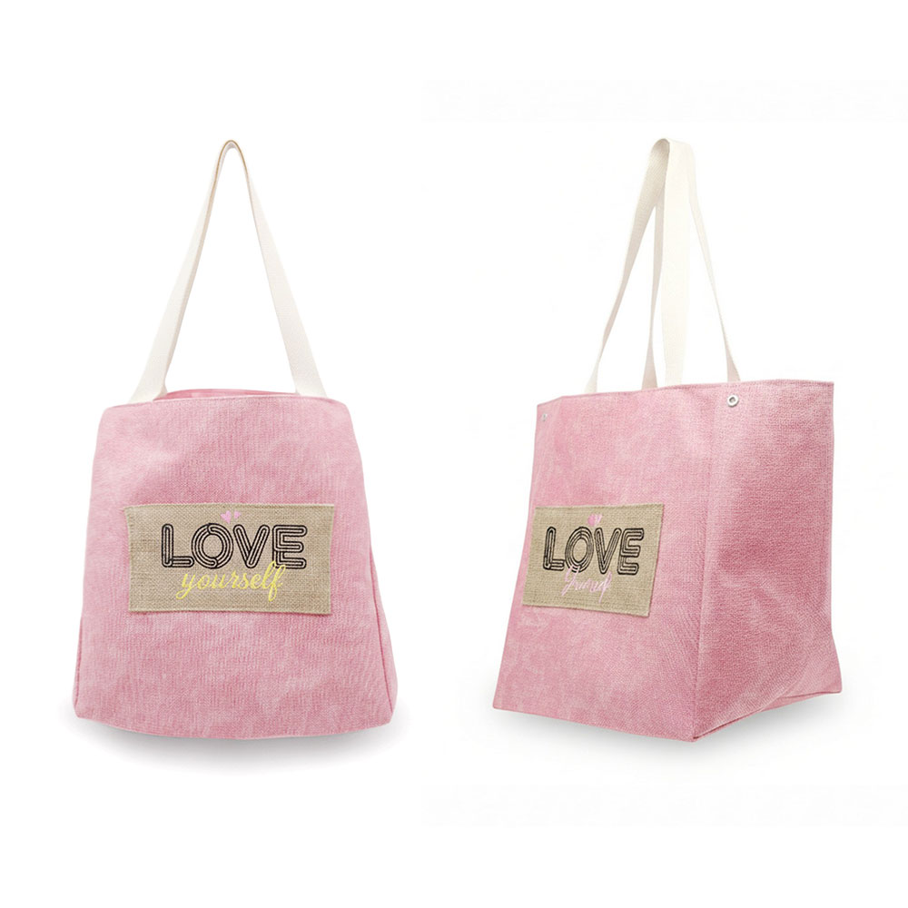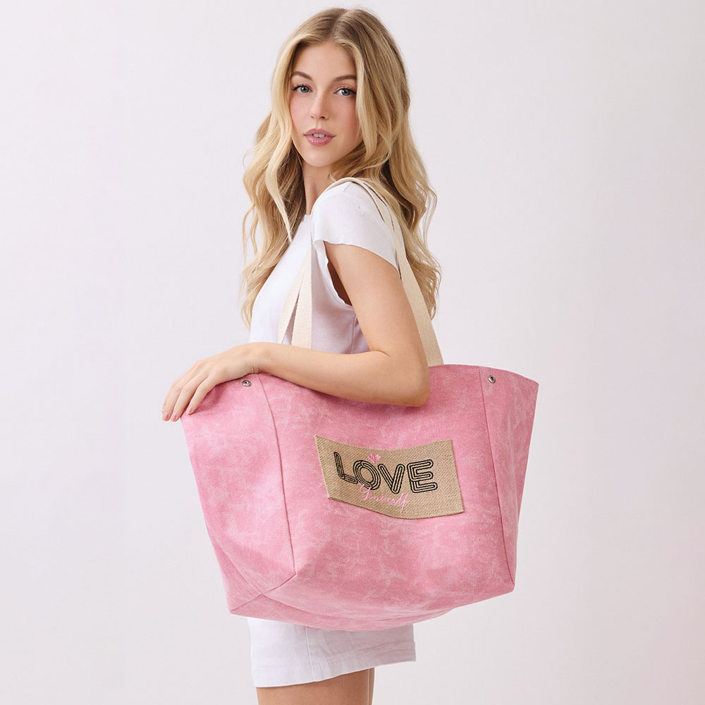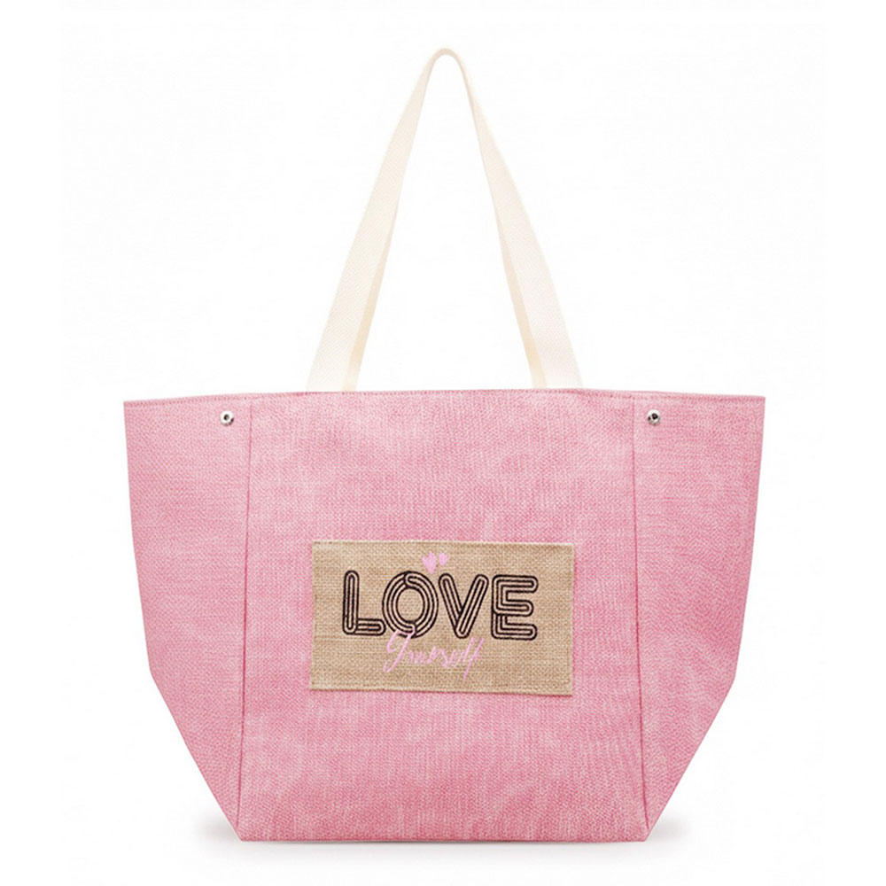 Details • Size : 22" X 13" X 9.5" • Inner Pocket • Magnetic Snap Closure • Material : 90% Polyester, 10% Burlap • Spacious everyday tote bag designed with a message patch for casual outings, travel, beach trips, and seasonal retail displays. Features a roomy interior and comfortable shoulder straps, making it ideal for carrying daily essentials, vacation must-haves, and warm-weather lifestyle accessories.