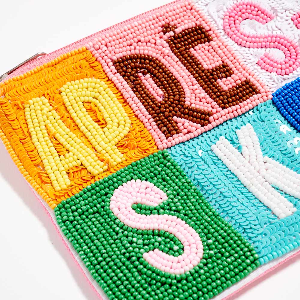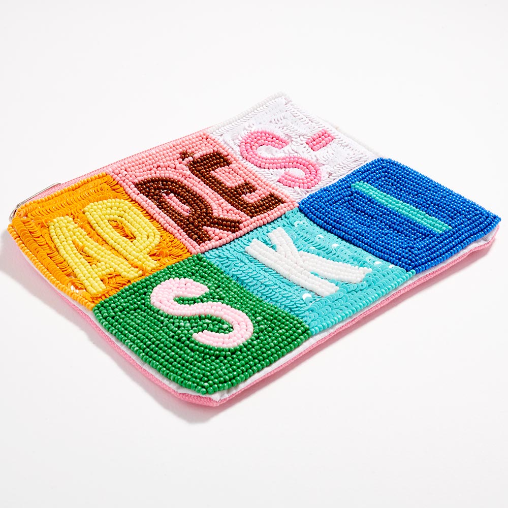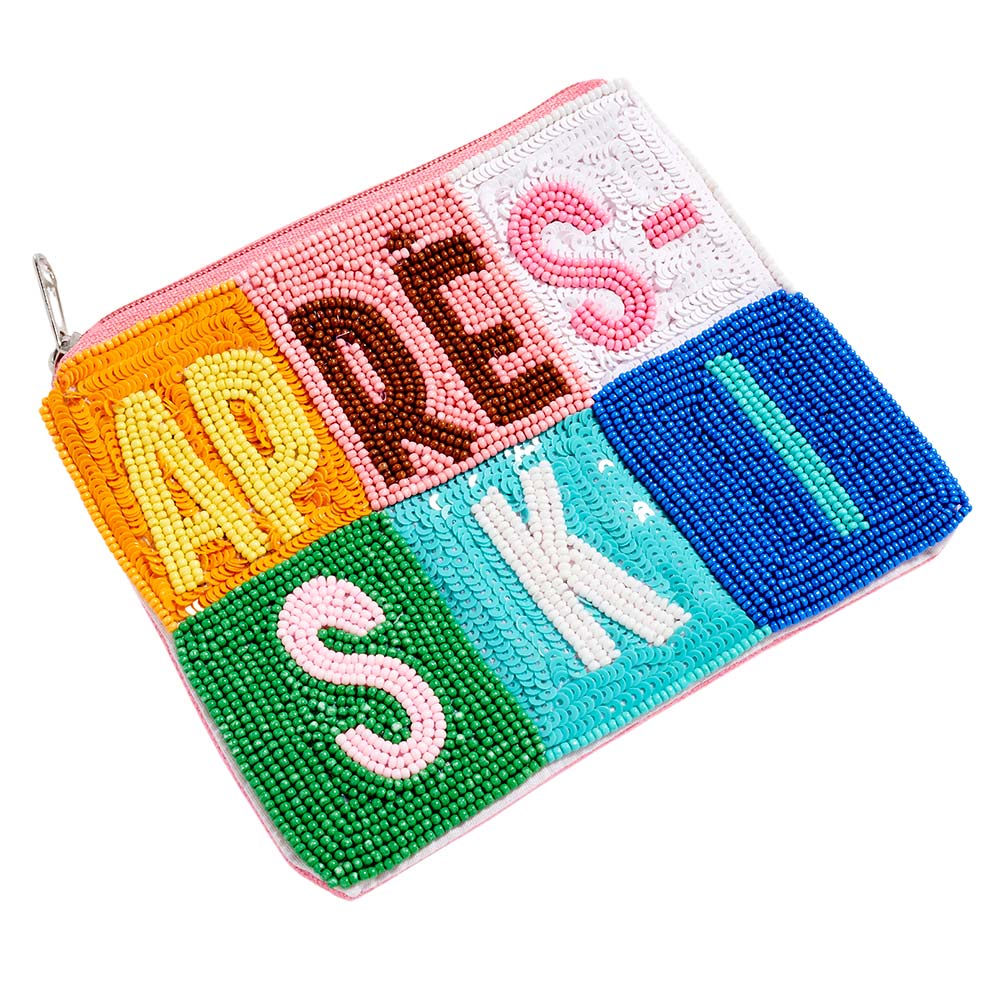 Details • Size : 5.5" X 4.5" (appx) • No Inside Pocket • Beads On Front Only • Bag Only (items are not included) • Zipper Closure • Eye-catching beaded zipper pouch with bold Apres Ski lettering, designed to organize small essentials, cosmetics, or travel items with style. A playful, gift-ready accessory ideal for resort boutiques, seasonal collections, and impulse displays, offering strong visual impact and everyday functionality for fashion-forward retail assortments. • Made In India