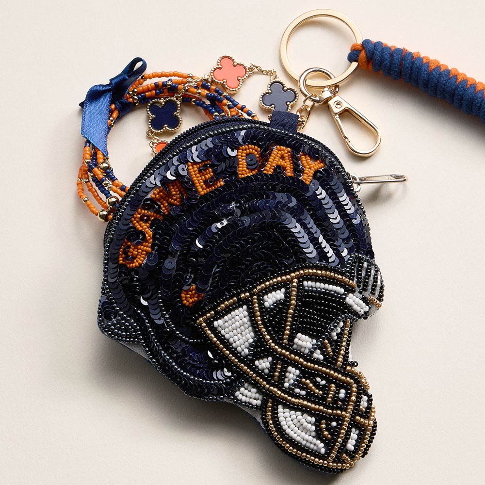 AUBURN GAME DAY Football Helmet Sequin Seed Beaded Knot Keychain Mini Pouch Bag