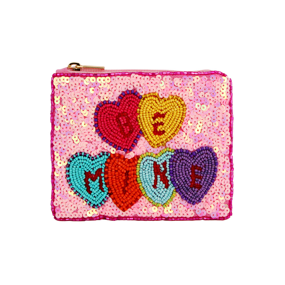 Details • Size : 5" X 4.25" • No Inside Pocket • Beads On Front Only • Zipper Closure • Fun sequin pouch featuring colorful heart candy motifs and playful beaded accents. Perfect for carrying small essentials, gifting, parties or adding a whimsical touch to everyday accessories. A bright, cheerful piece that brings personality and charm to any look. • Made In India