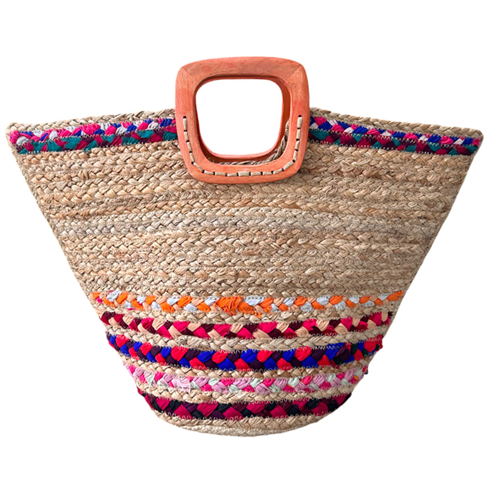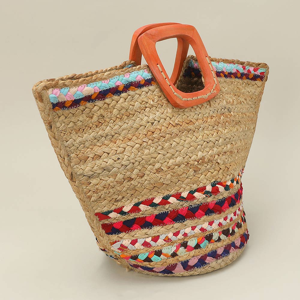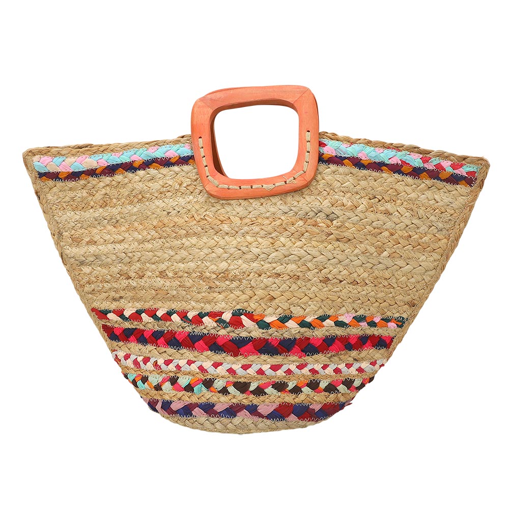 Boho Tribal Pattern Wooden Handle Straw Tote Bag