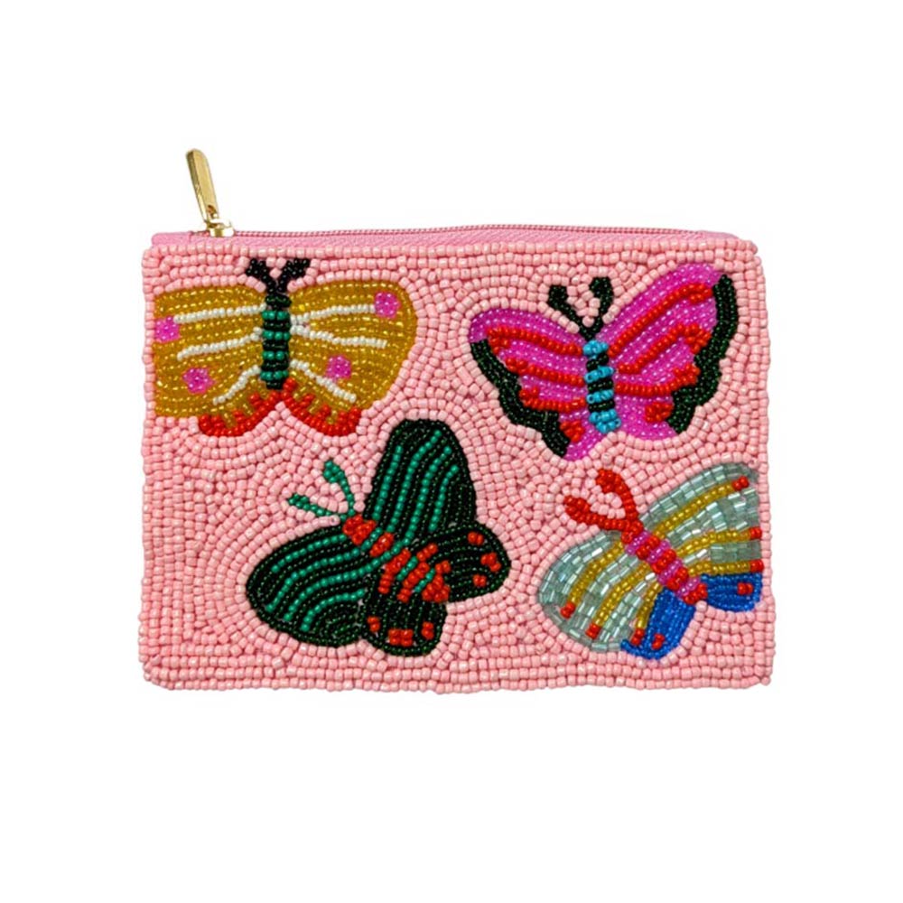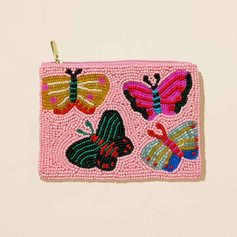 Details • Size : 5" X 3.75" (appx) • No Inside Pocket • Beads On Front Only • Bag Only (items are not included) • Zipper Closure • Decorative zipper coin pouch featuring detailed butterfly motifs with textured beaded design. Compact size makes it ideal for holding coins, cards, keys, or small essentials while adding a playful statement to everyday accessories. Perfect for gifting, travel organization, or boutique accessory collections. • Made In India