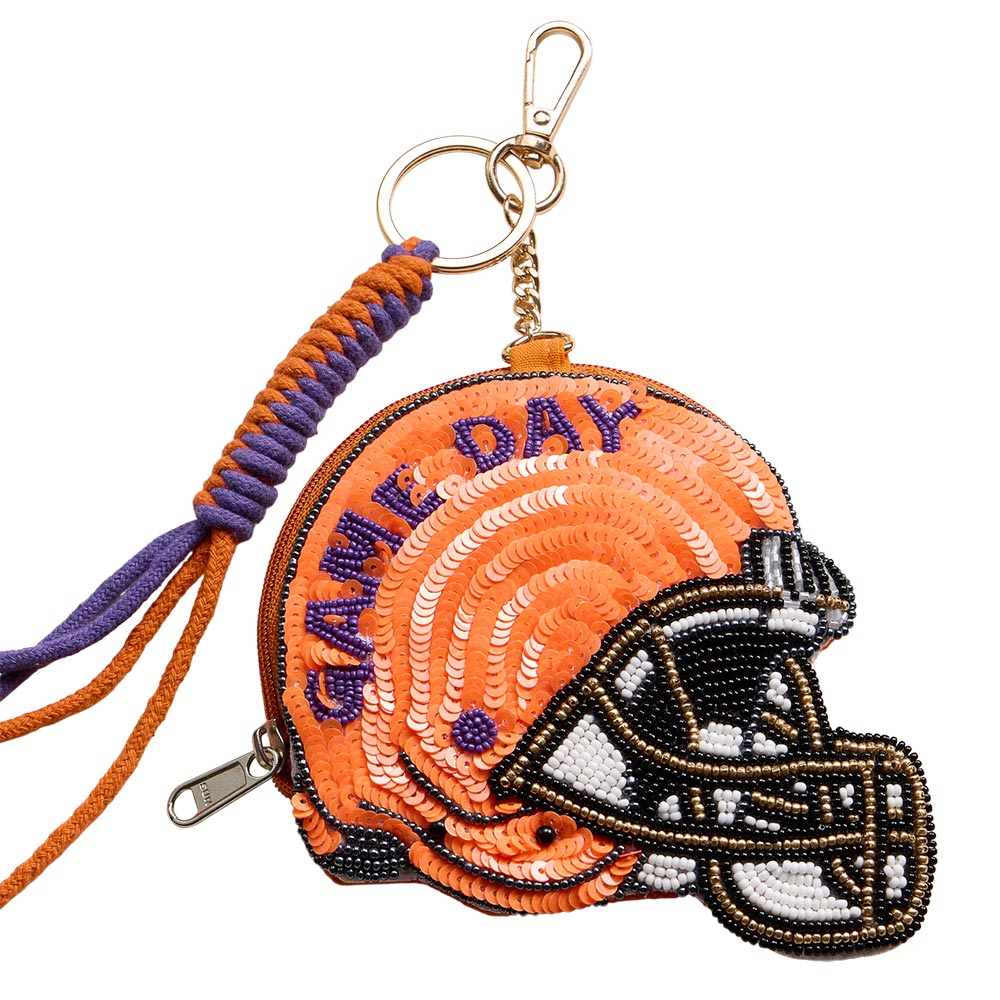 CLEMSON GAME DAY Football Helmet Sequin Seed Beaded Knot Keychain Mini Pouch Bag