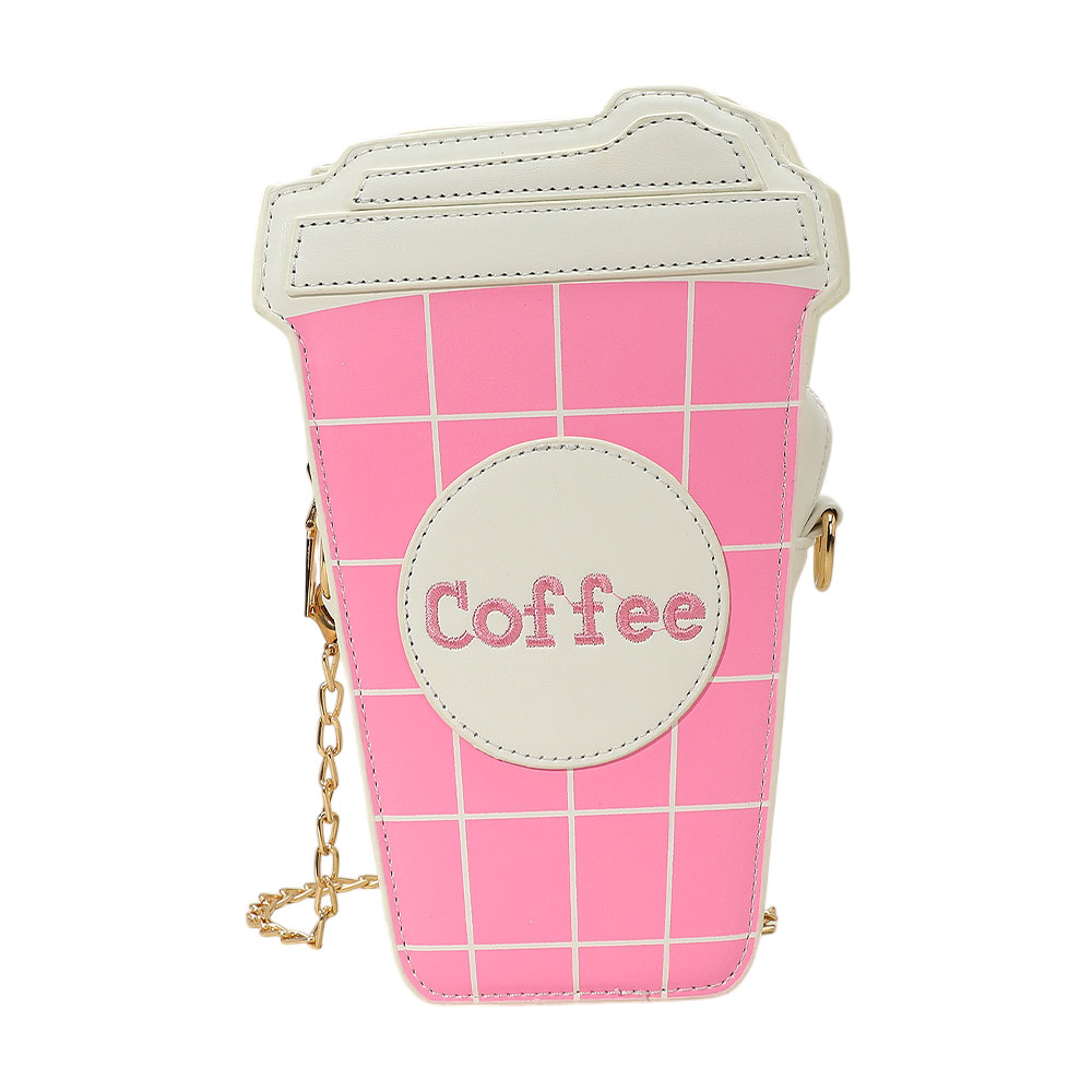 • Fun and stylish coffee cup shaped crossbody bag featuring a grid design, bold "Coffee" print, and a sleek chain strap. A quirky and eye-catching accessory ideal for cafĂ© lovers and trendsetters.
