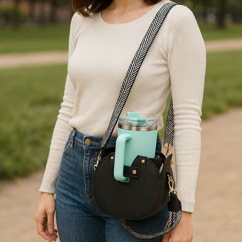 • Functional crossbody cup carrier bag featuring a structured silhouette, secure top closure and wide adjustable strap. Designed to hold cups or tumblers while offering space for daily essentials, making it ideal for travel, errands and hands-free convenience.