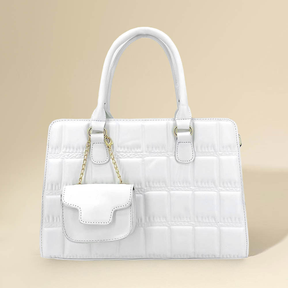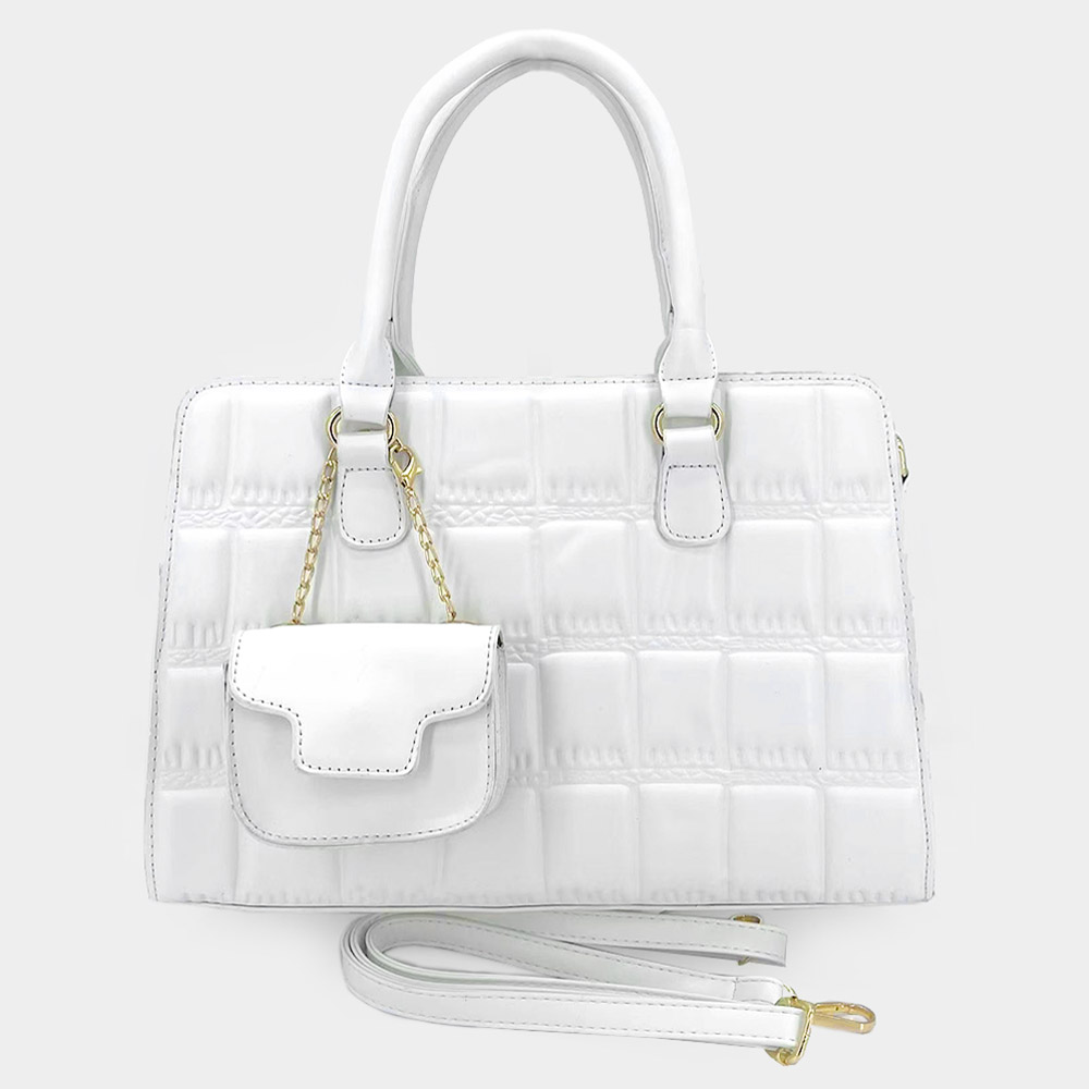 Details • Size : 12.5" X 4.5" X 8.5" • Top Handle Size : 5.25" L • Mini Bag Size : 3.8" X 1.75" X 3.2" • Crossbody Strap Size : Adjustable / Detachable • Zipper Closure • One Inside Slip Pocket • Elevate your style with this structured handbag featuring a chic embossed pattern and matching detachable mini pouch. Spacious yet refined, this versatile tote is perfect for work, casual outings, or special occasions, offering elegance and functionality in one.
