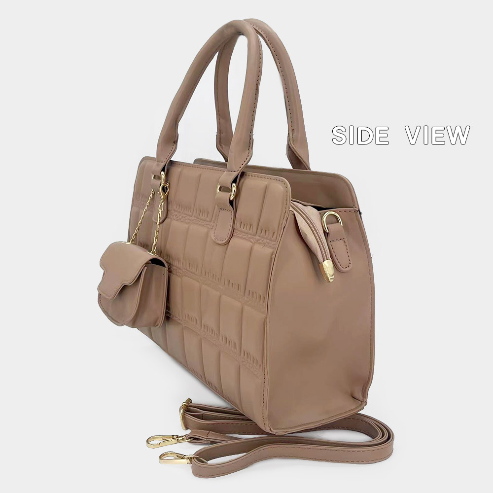 • Elevate your style with this structured handbag featuring a chic embossed pattern and matching detachable mini pouch. Spacious yet refined, this versatile tote is perfect for work, casual outings, or special occasions, offering elegance and functionality in one.