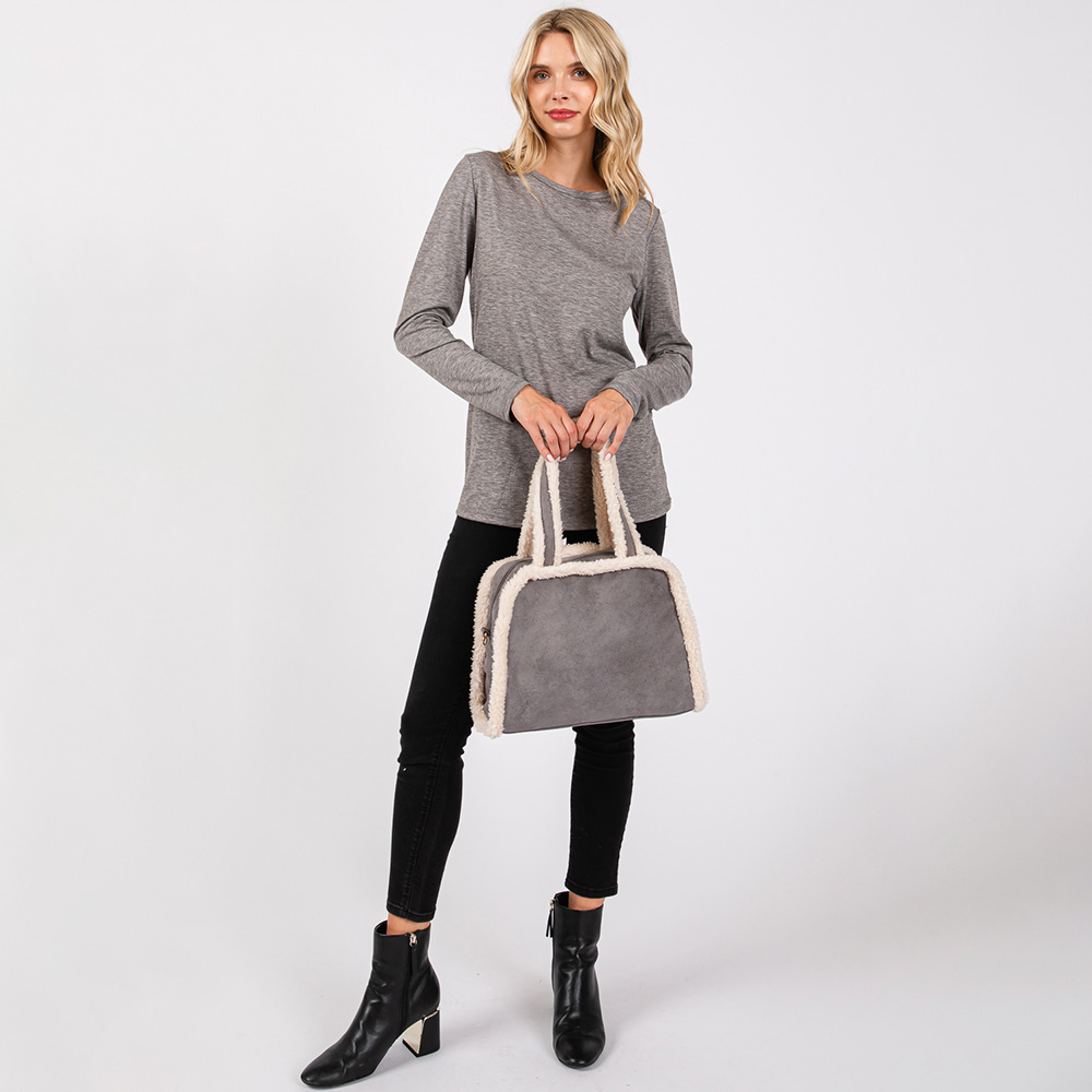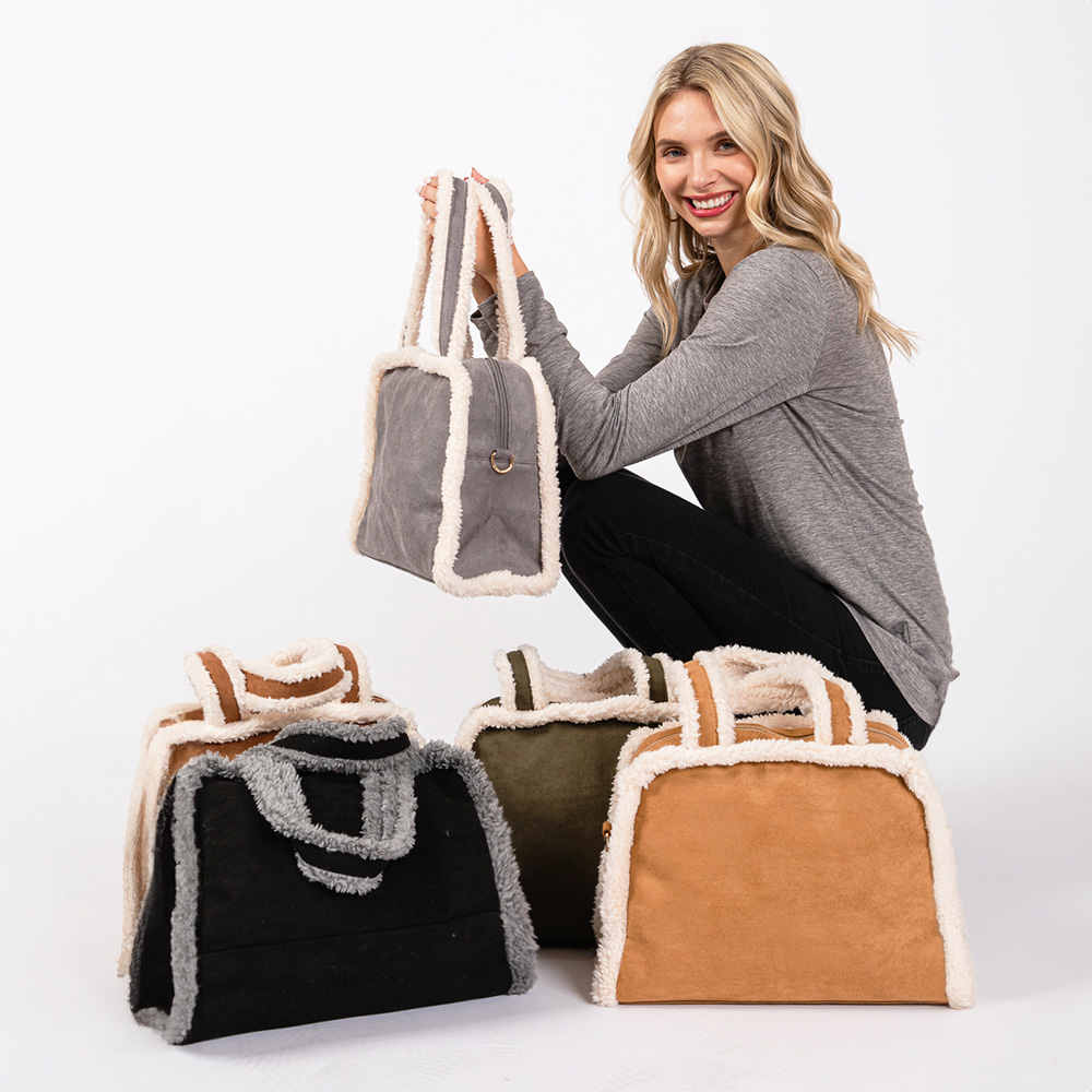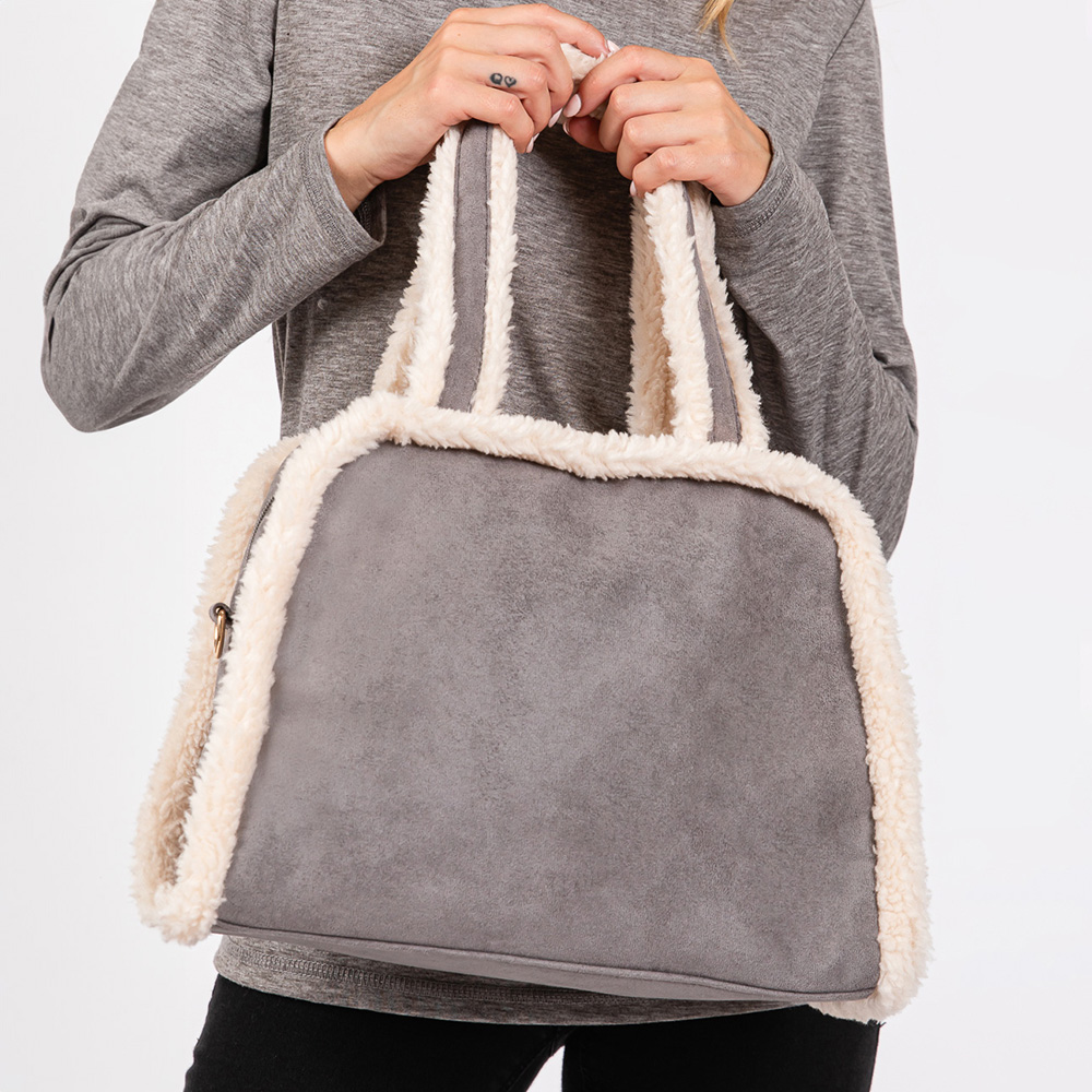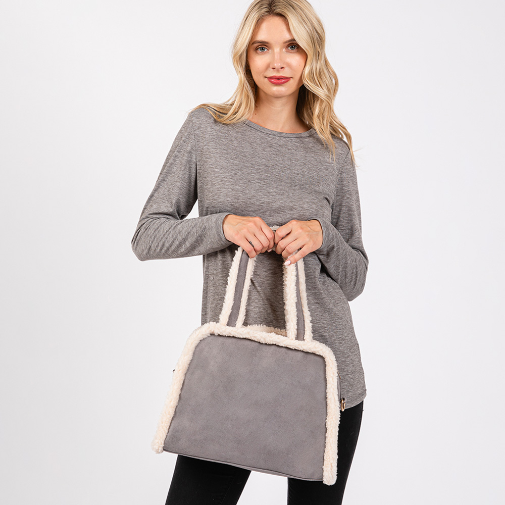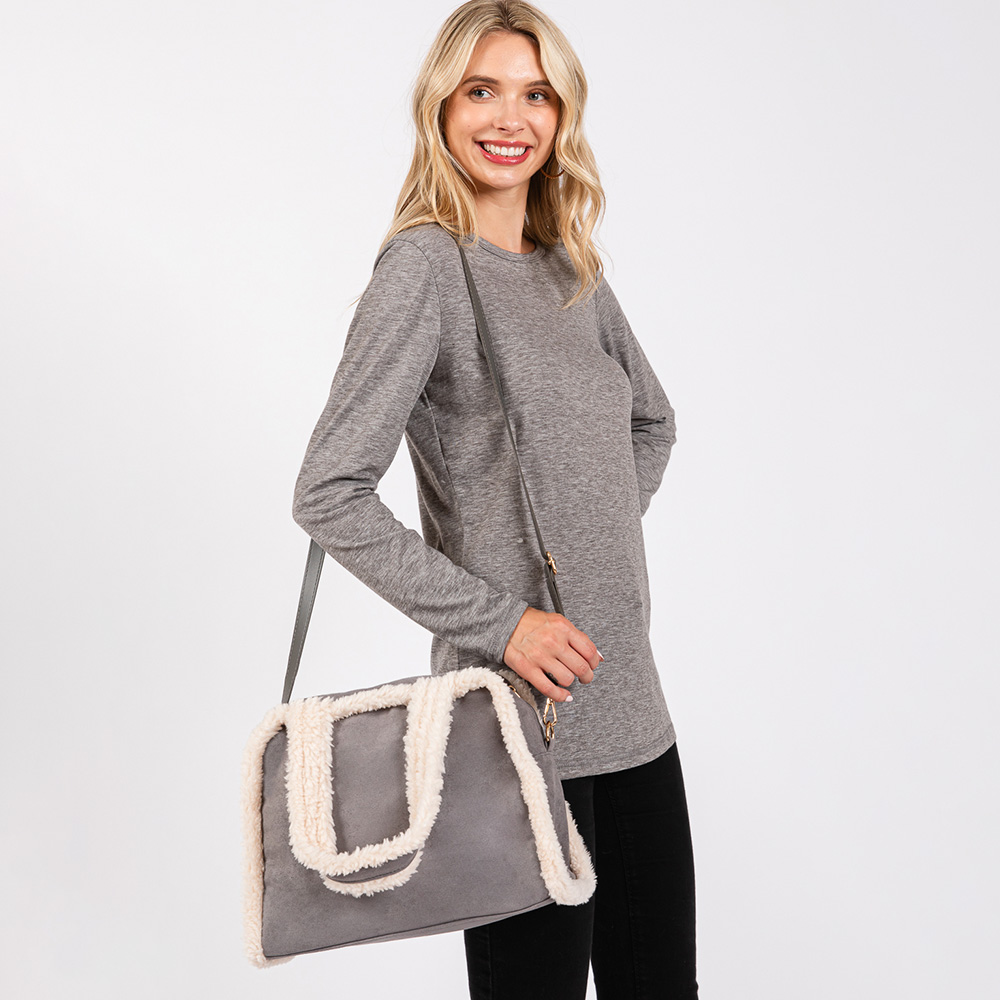 Fleece Trimmed Solid Tote / Crossbody Bag With Adjustable Strap
