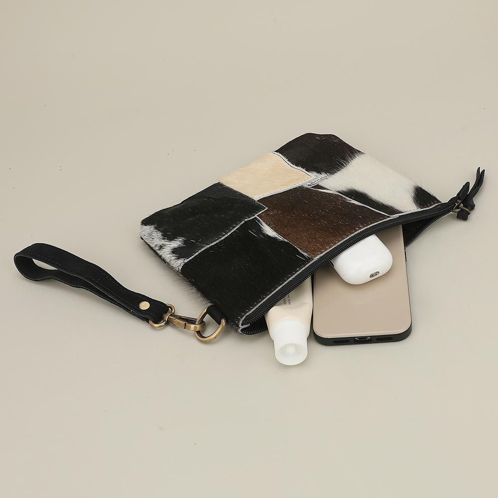 Details • Size : 8.75" X 7" • Wristlet Size : 8" L • Zipper Closure • Stylish cowhide wristlet pouch clutch with patchwork front, secure zip closure, and detachable strap. Compact yet spacious enough for phone, keys, and daily essentials. Perfect for travel, errands, or organizing items inside larger bags with a chic, functional touch. • Colors May Vary • Made In India