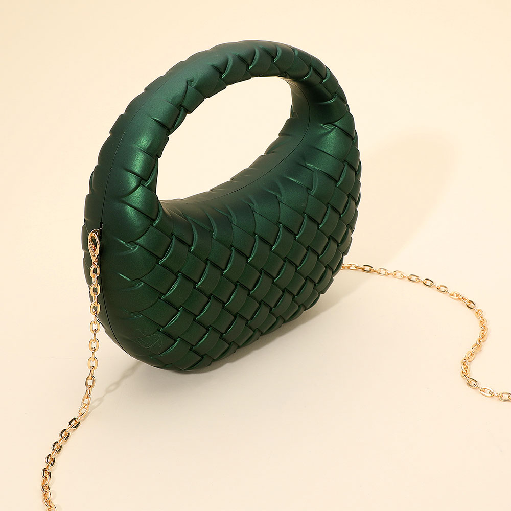 Details • Size : 8.5" X 4" X 2.75" • Top Handle Size : 3.75" L • Strap Size : 46" L / Detachable • Magnetic Closure • A stylish woven-pattern evening clutch designed with a sculpted handle and a sleek silhouette. The compact shape offers modern sophistication, while the detachable chain strap adds versatile wear for special events, nights out, and elegant occasions.