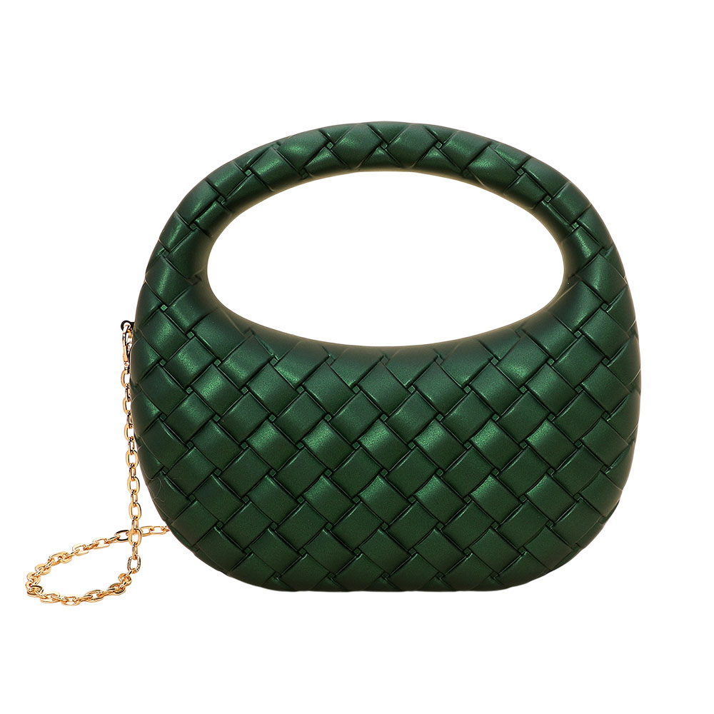 • A stylish woven-pattern evening clutch designed with a sculpted handle and a sleek silhouette. The compact shape offers modern sophistication, while the detachable chain strap adds versatile wear for special events, nights out, and elegant occasions.