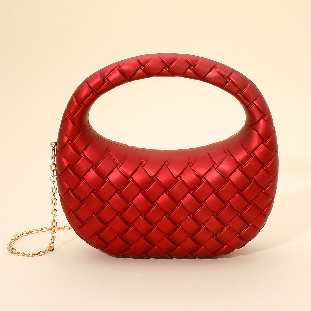 Details • Size : 8.5" X 4" X 2.75" • Top Handle Size : 3.75" L • Strap Size : 46" L / Detachable • Magnetic Closure • A stylish woven-pattern evening clutch designed with a sculpted handle and a sleek silhouette. The compact shape offers modern sophistication, while the detachable chain strap adds versatile wear for special events, nights out, and elegant occasions.