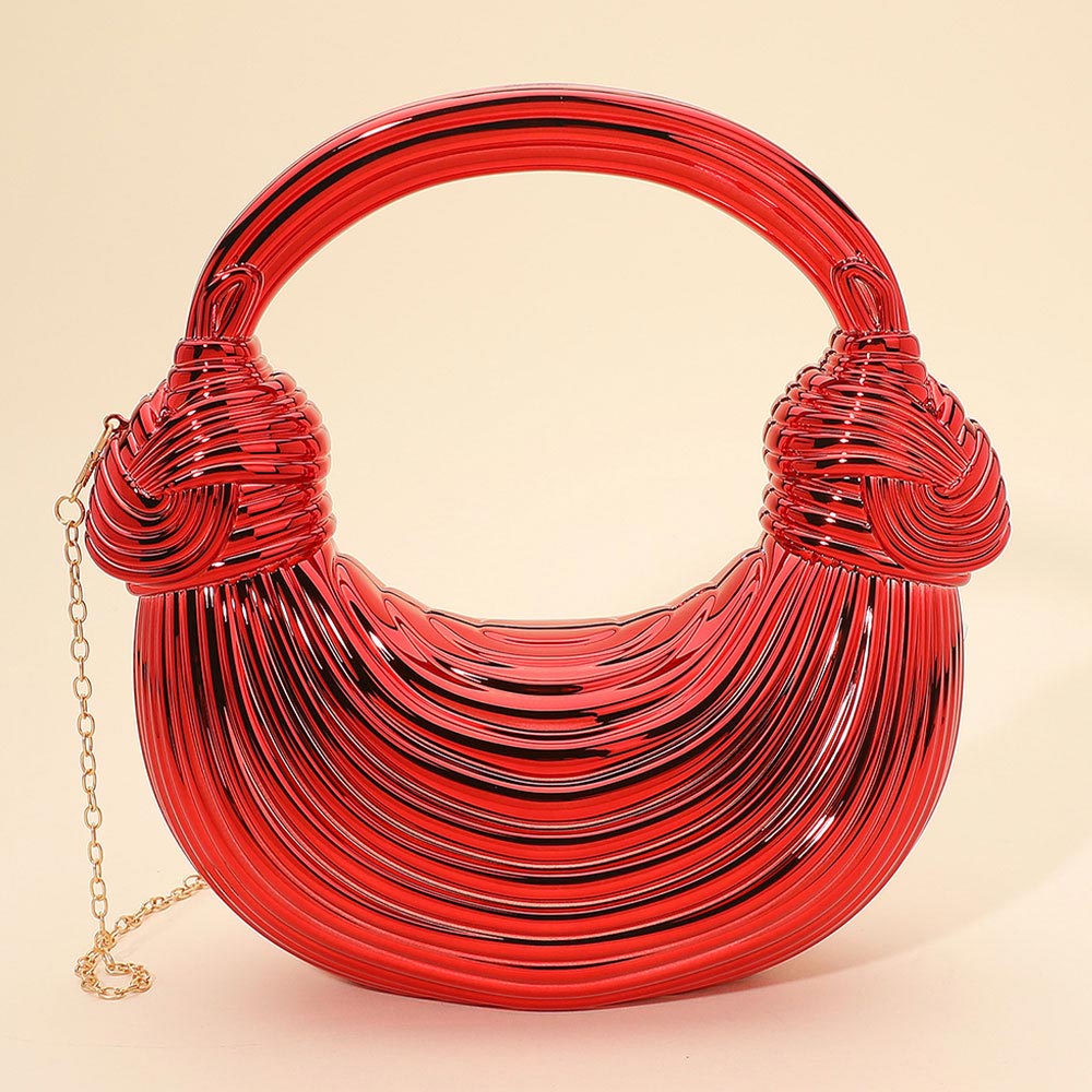 Details • Size : 10" X 10" X 3.25" • Top Handle Size : 5" L • Strap Size : 46" L / Detachable • Magnetic Closure • This sculpted fashion bag features a distinctive loop-handle silhouette with layered, curved ridges that create a bold, fluid shape. A sleek chained detail adds versatility, making it an expressive accessory that elevates evening outfits and modern, statement-driven looks.