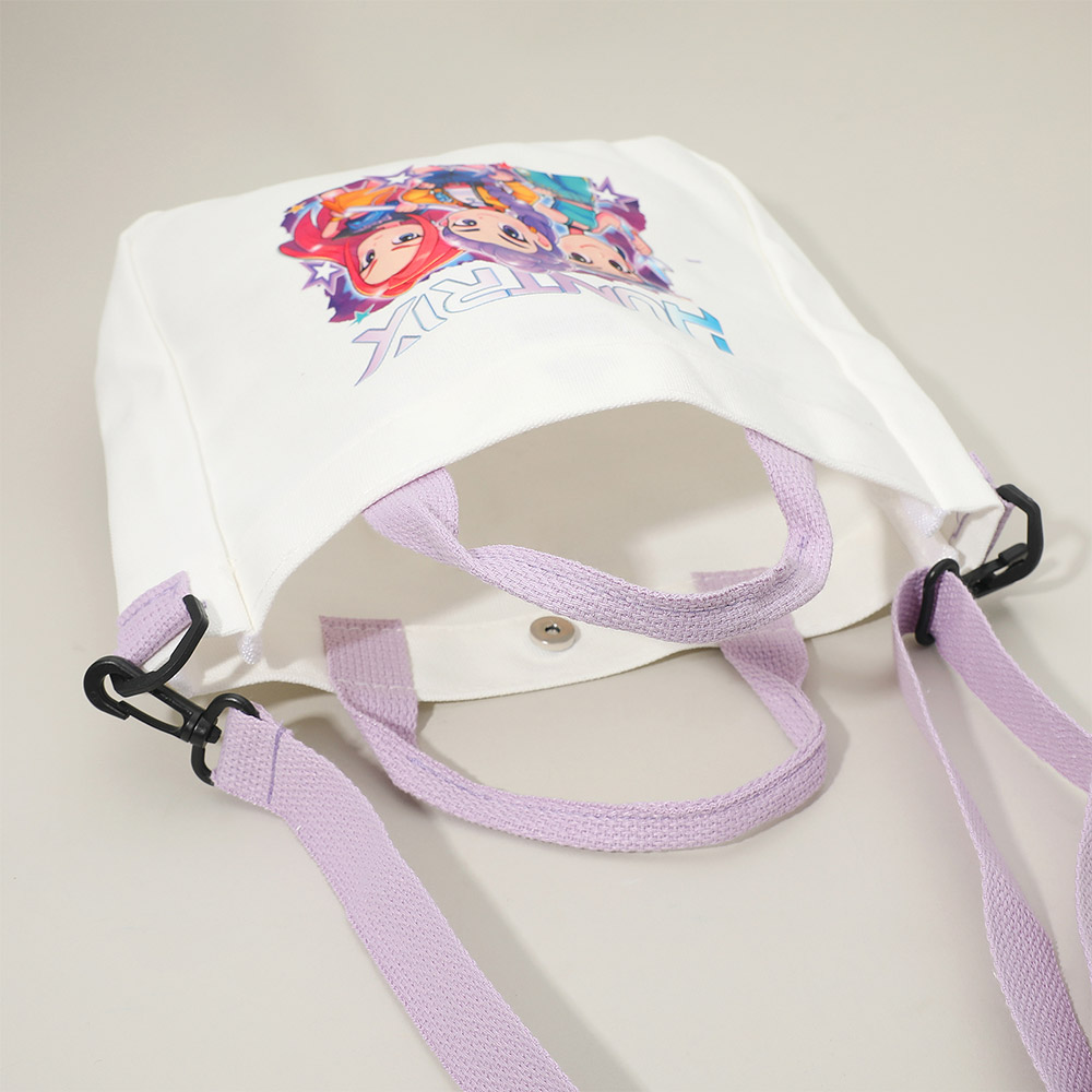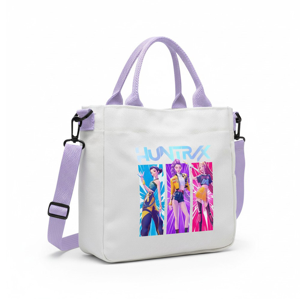 Details • Size : 9.5" X 9" X 2.25" • Top Handle Size : 3.5" L • Strap Size : 41" L / Detachable, Adjustable • Magnetic Closure • Material : 100% Polyester • Stylish tote bag featuring bold HUNTR/X character artwork with a practical carry design ideal for daily errands, shopping, events, conventions, or casual outings. Lightweight and spacious enough for essentials, making it a versatile accessory for fans and everyday use.