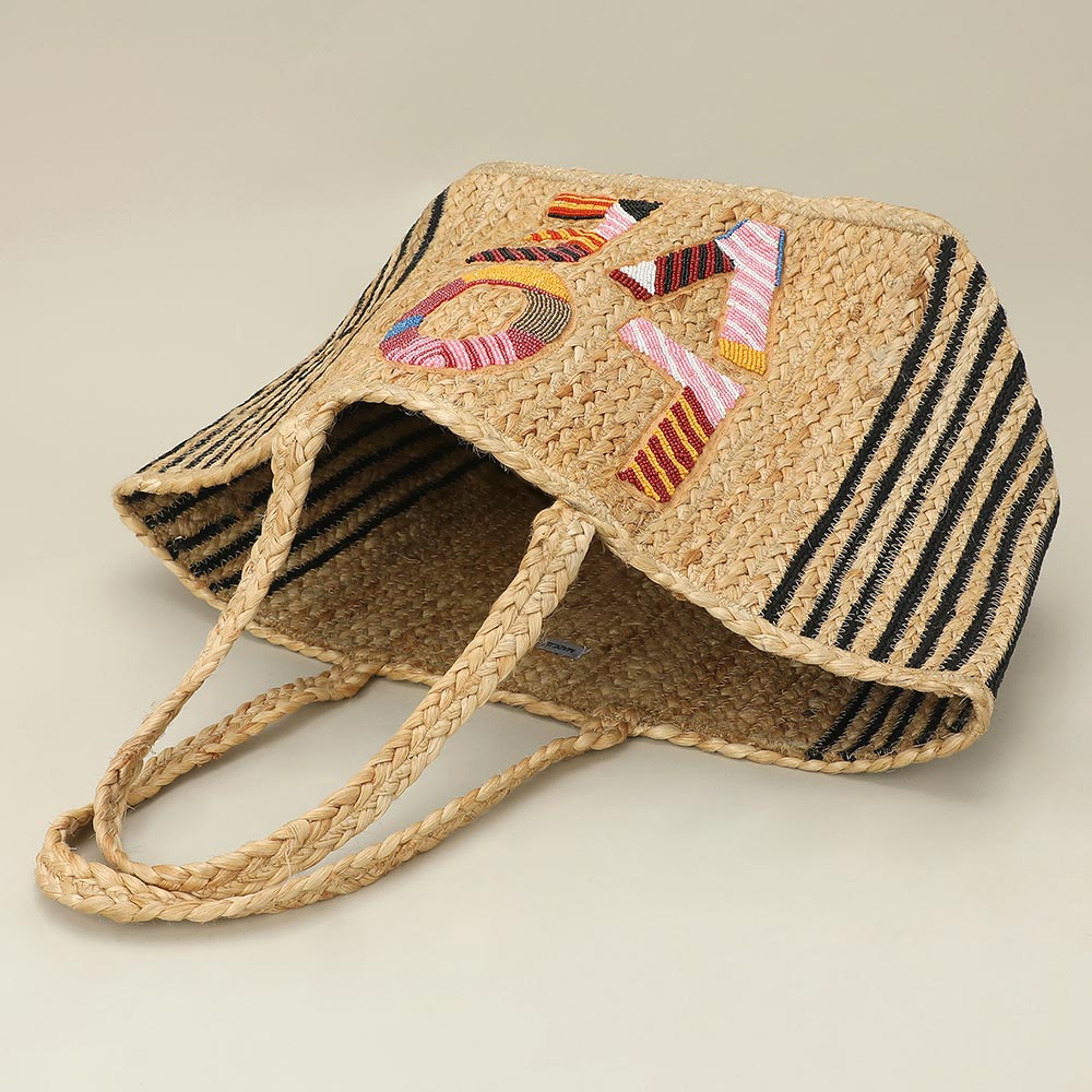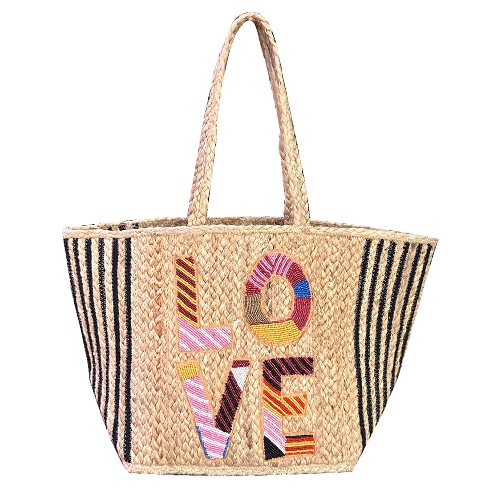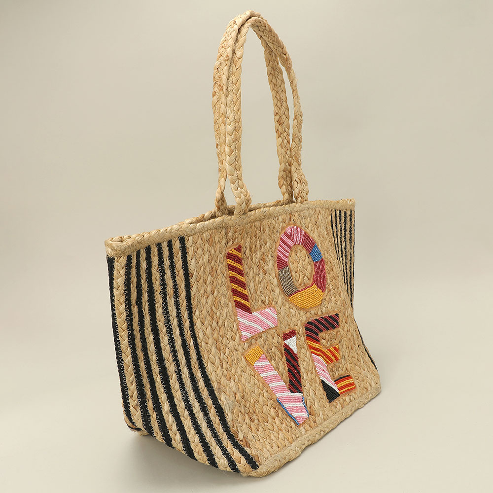 Details • Size : 19.5" X 11.5" X 8.25" • Top Handle Size : 7.5" L • Statement woven tote bag featuring bold LOVE lettering with decorative detailing for a playful, eye-catching look. Spacious interior easily carries daily essentials, making it ideal for shopping, travel, or casual outings. Lightweight yet structured, this tote is perfect for boutiques seeking expressive, trend-forward statement bags. • Made In India