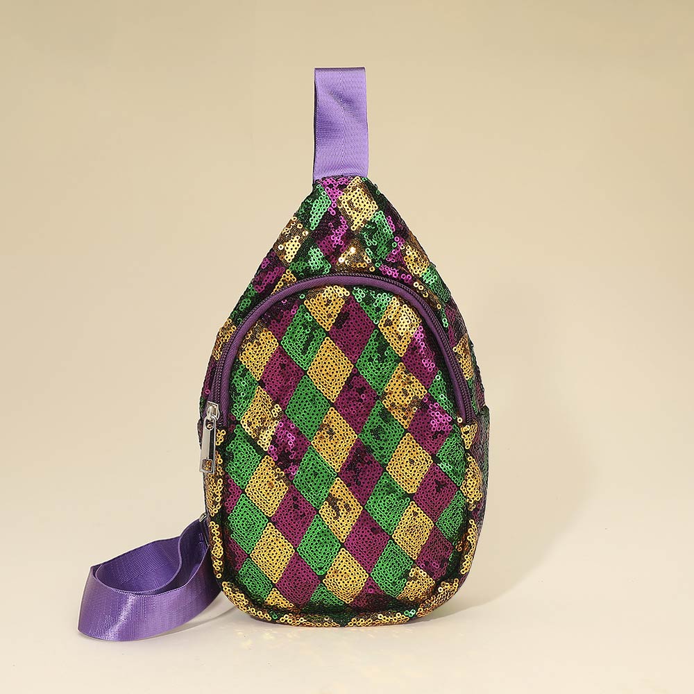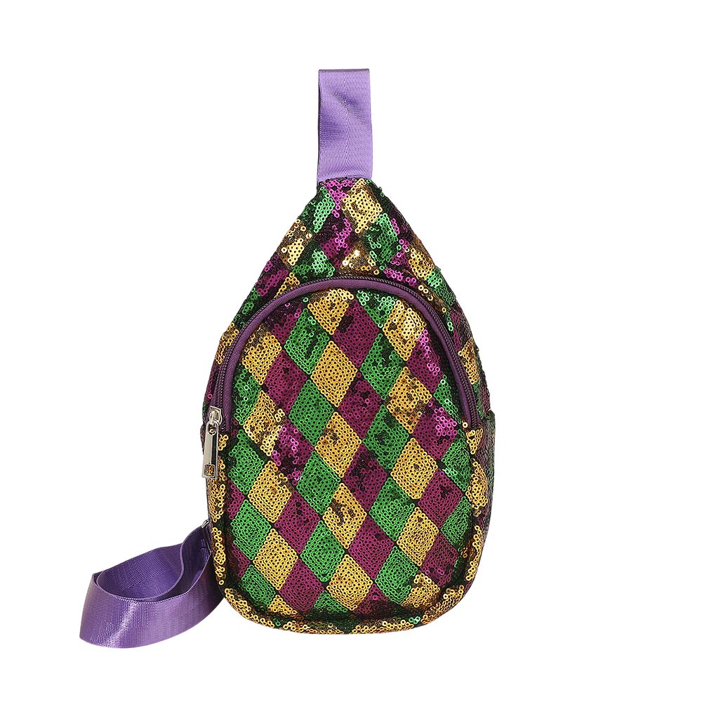 Details • Size : 6.25" X 11.25" X 3.2" • Strap Size : Adjustable • Zipper Closure • Eye catching diamond sequin sling backpack designed for festivals, themed events, travel, and everyday hands free wear. Features a secure zipper closure, adjustable strap, and compact interior ideal for carrying essentials. A strong boutique accessory for seasonal promotions, party collections, and customers seeking statement style with practical functionality.