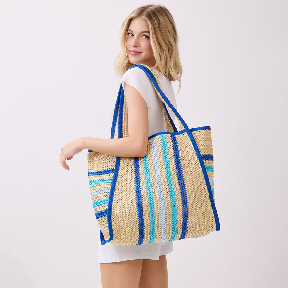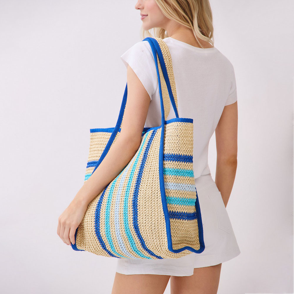 Details • Size : 20" X 14" X 5.5" • Inner Pocket • Magnetic Snap Closure • Material : 100% Paper • Spacious oversized tote bag designed for everyday carry, travel, shopping, and beach use. Features a structured silhouette with vertical stripe detailing, comfortable shoulder straps, and an open interior for easy access. A versatile statement bag ideal for boutique and lifestyle collections.