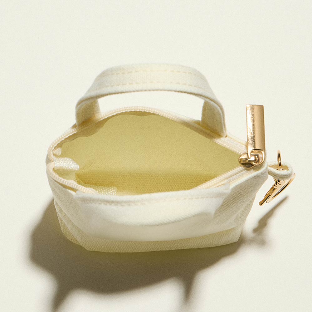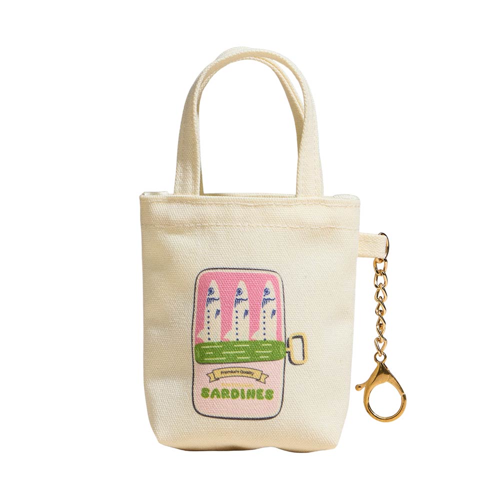 Details • Size : 4.25" X 5" • Strap Size : 2.5" L • Zipper Closure • Sardines mini tote keychain bag designed as a playful novelty accessory for keys, charms, and small essentials. Features a compact tote shape with top handles and attached keyring, perfect for bags, backpacks, gifting, summer themes, travel collections, and impulse-buy displays in boutique and lifestyle retail settings.