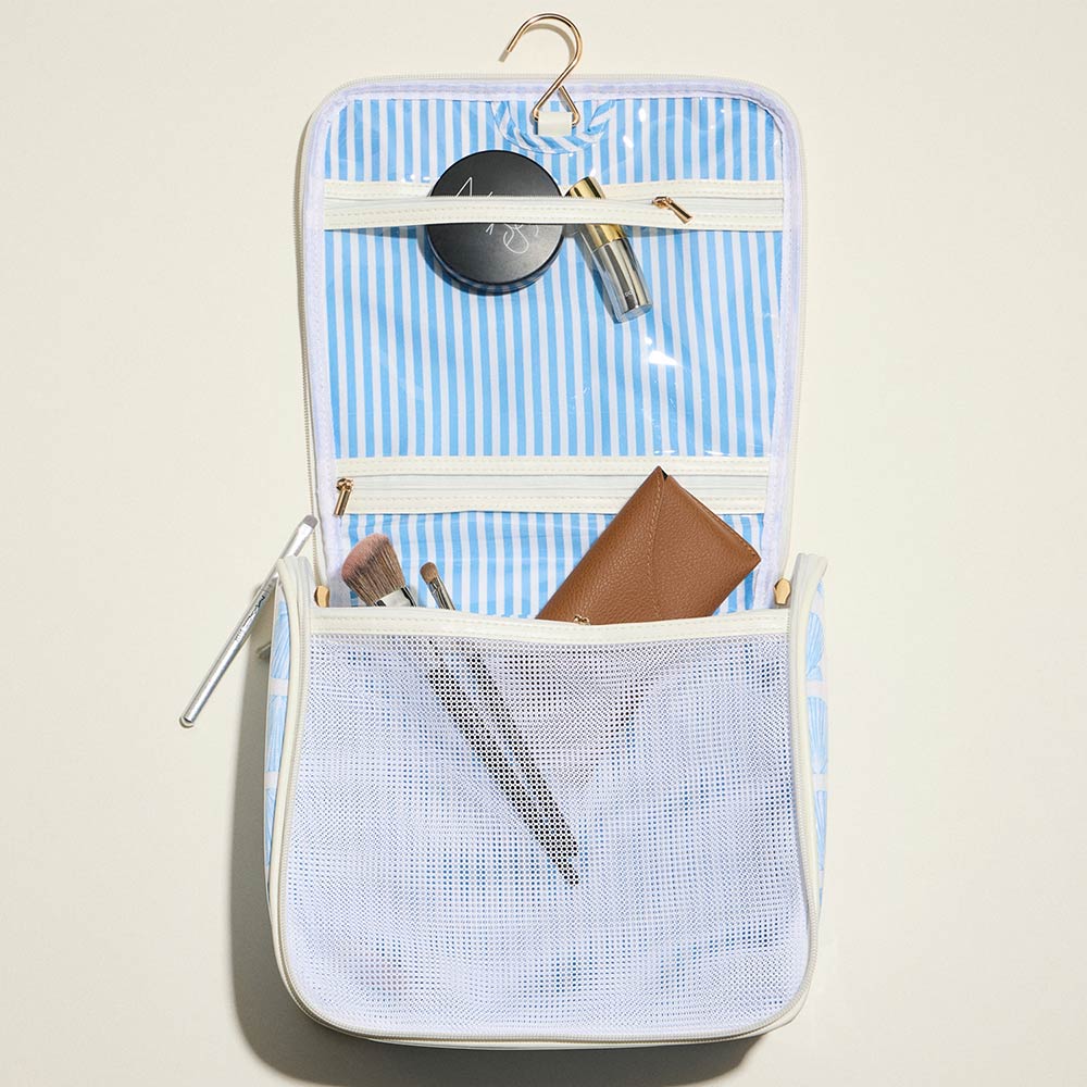 • A compact hanging travel organizer designed to keep beauty and personal essentials neatly stored. Features multiple zip compartments and mesh sections for easy visibility and access. Ideal for trips, gym use, or everyday organization with space-saving convenience.