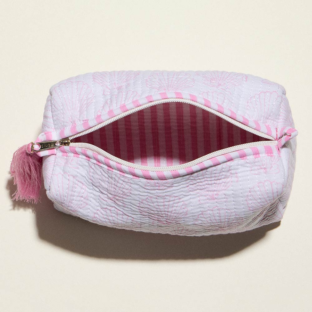 Details • Size : 6.5" X 4" X 3" • Zipper Closure • Quilted shell pattern cosmetic pouch designed for organizing makeup, toiletries, and small daily essentials. Features a softly padded structure, smooth zip closure, and tassel accent for added style. Compact yet roomy for travel, handbags, or vanity storage, making it a charming and practical accessory or gift option.