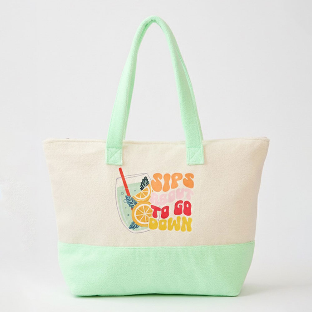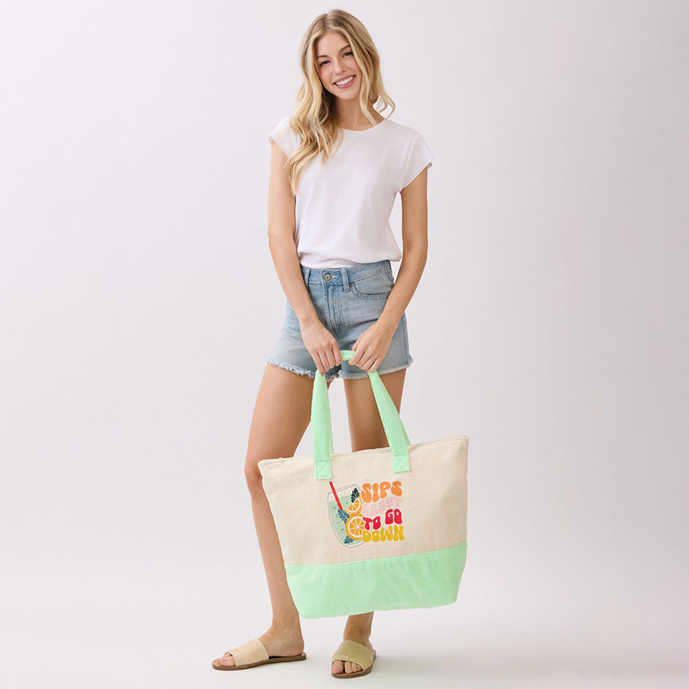 Details • Size : 22" X 16" X 6" • Inner Pocket • Zipper Closure • Material : 80% Polyester, 20% Polyamide • Playful summer themed tote bag featuring a fun “Sips to Go Down” drink inspired graphic. Perfect for beach days, poolside lounging, shopping, or vacation travel, this roomy carryall holds daily essentials while adding a relaxed, fun seasonal vibe to warm weather outings.