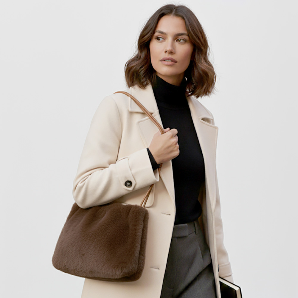 • Elevate your winter look with this soft faux fur shoulder bag, designed for comfort and sophistication. Featuring a structured silhouette and cozy texture, it’s perfect for everyday wear or elegant evenings, adding a touch of warmth and luxury to any outfit.