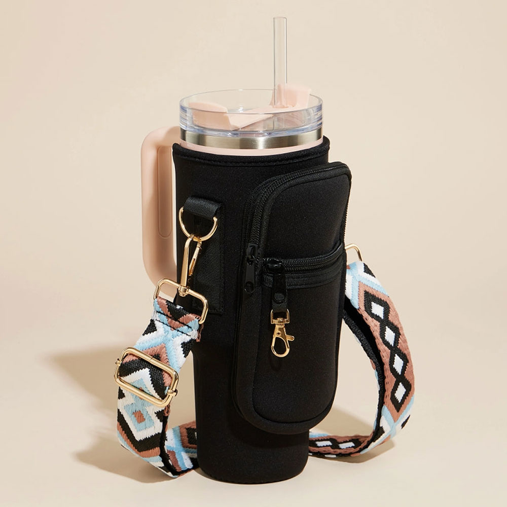 Solid Tumbler Carrier Holder Aztec Pattern Strap Crossbody Bag