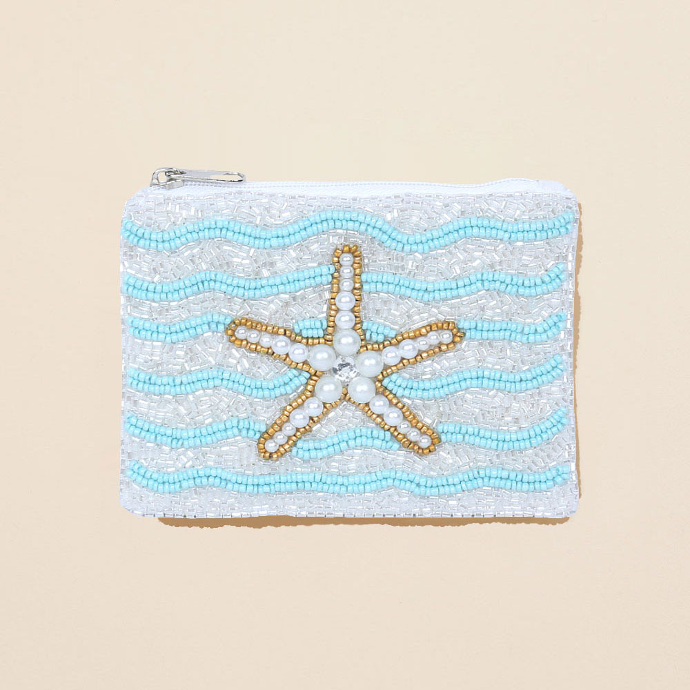 Details • Size : 5" X 3.75" (appx) • No Inside Pocket • Beads On Front Only • Bag Only (items are not included) • Zipper Closure • Embrace seaside charm with this intricately beaded coin pouch featuring a radiant starfish accent and wave-inspired detailing. Perfect for carrying small essentials, it adds a touch of coastal elegance to everyday outings and beach-ready looks with its eye-catching design. • Made In India