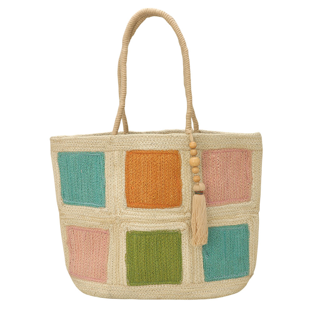 Details • Size : 17.5" X 12.5" X 6" • Top Handle Size : 8" L • Tassel Size : 8.5" L • Spacious woven tote bag designed with a patchwork-inspired pattern and decorative tassel accent for relaxed everyday style. Roomy interior comfortably carries daily essentials, making it perfect for shopping, travel, or casual outings. A lightweight, versatile accessory ideal for boutiques seeking unique, handcrafted-style statement bags. • Made In India