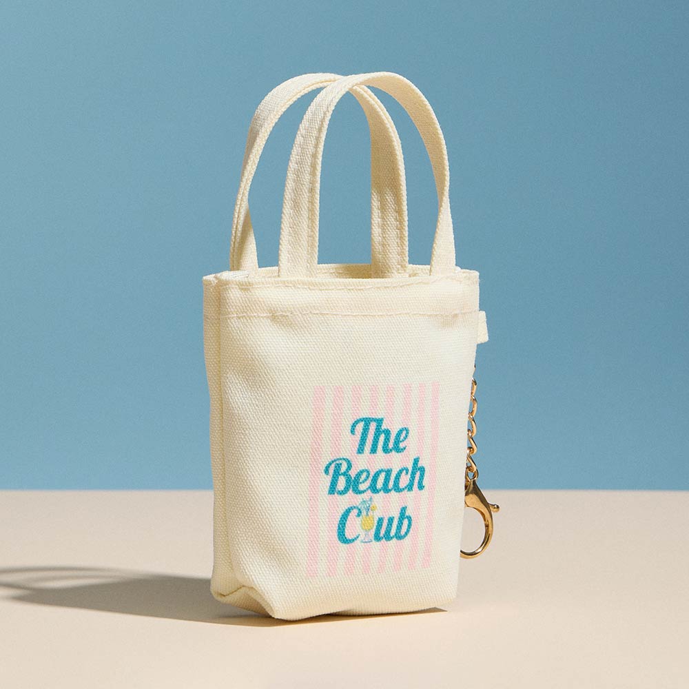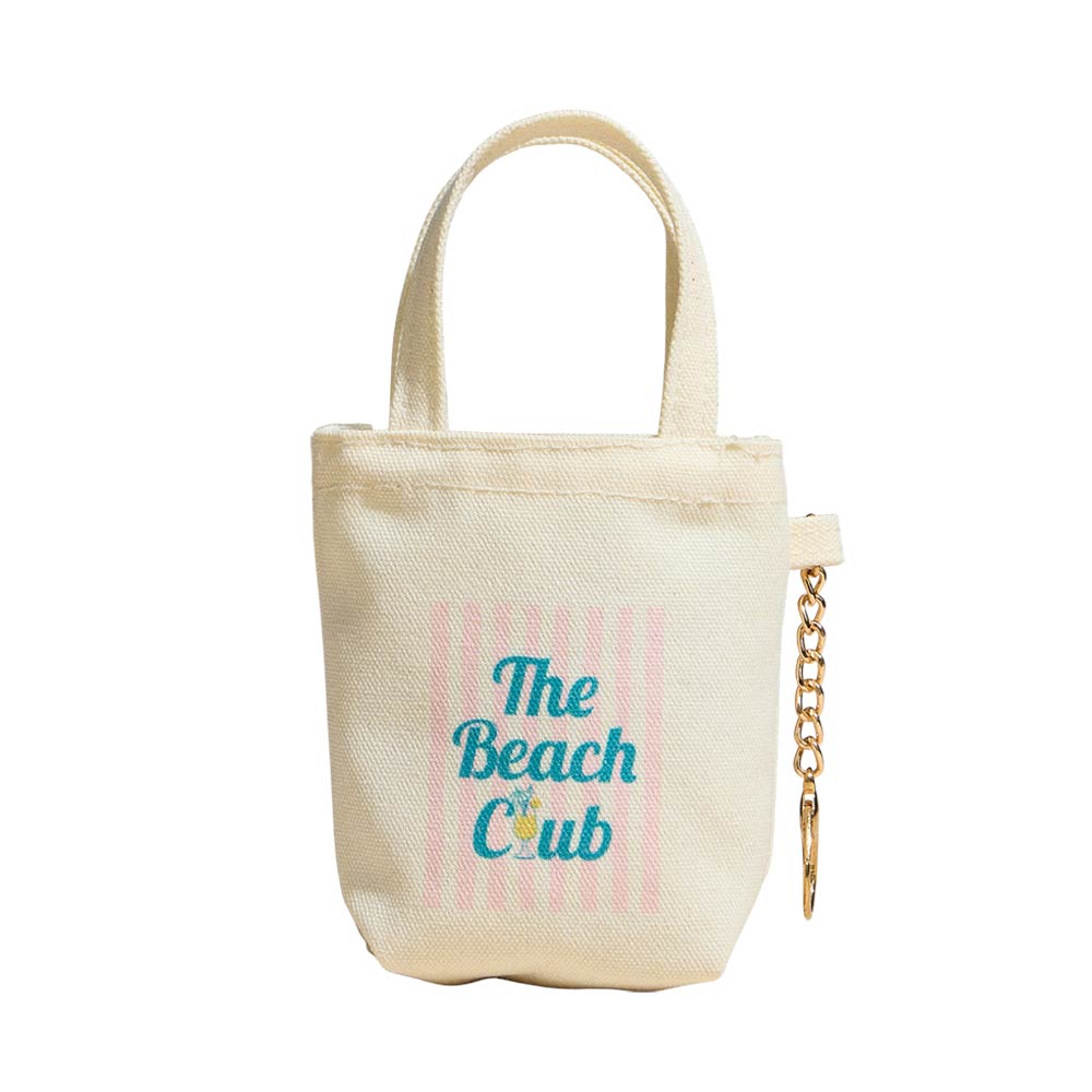 Details • Size : 4.25" X 5" • Strap Size : 2.5" L • Zipper Closure • Beach Club mini tote keychain bag designed as a stylish accessory for keys, charms, and small essentials. Features a compact tote silhouette with top handles and attached keyring, making it ideal for bags, backpacks, gifting, and seasonal displays. A playful novelty accessory perfect for boutiques, summer collections, travel themes, and impulse-buy retail sections.